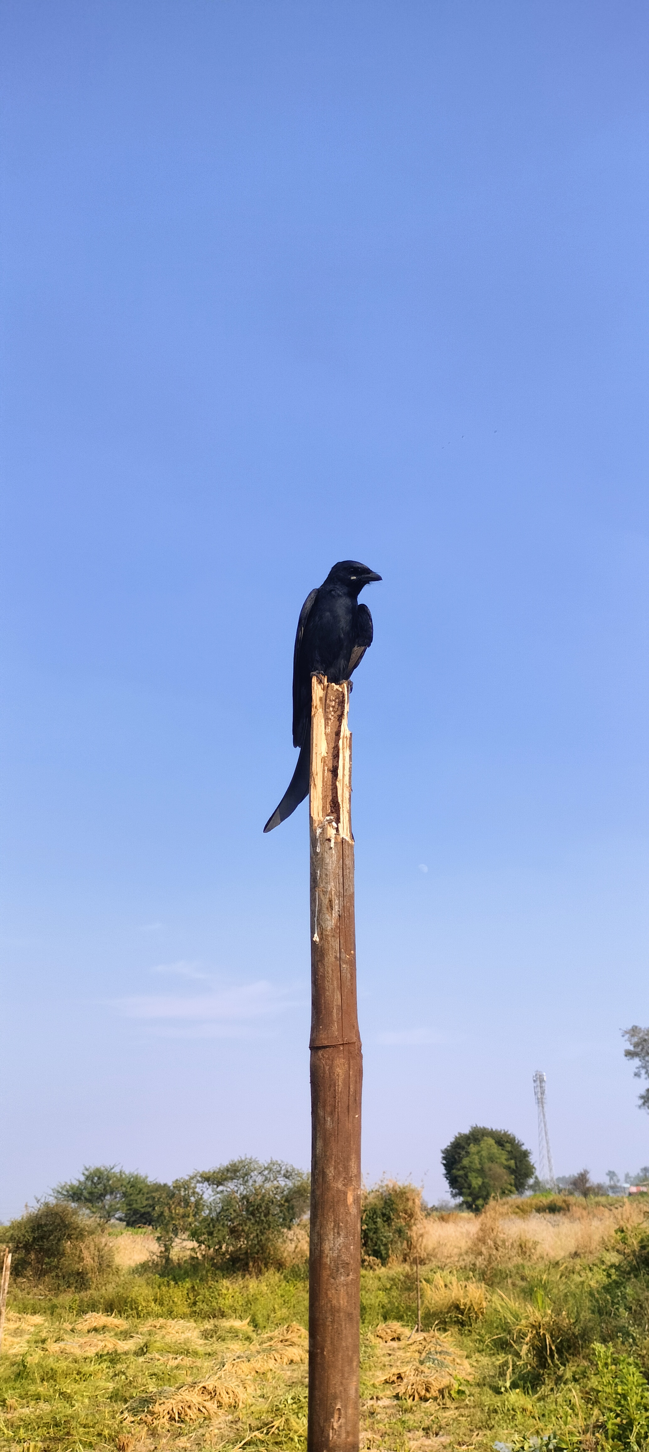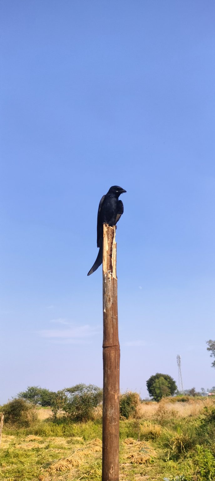 Alternative Text: A black drongo standing tall against the clear blue sky.