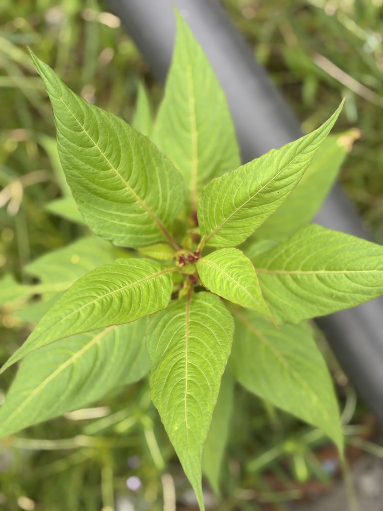 Alternative Text: A close-up view of a green plant with broad, vibrant leaves radiating from a central point.