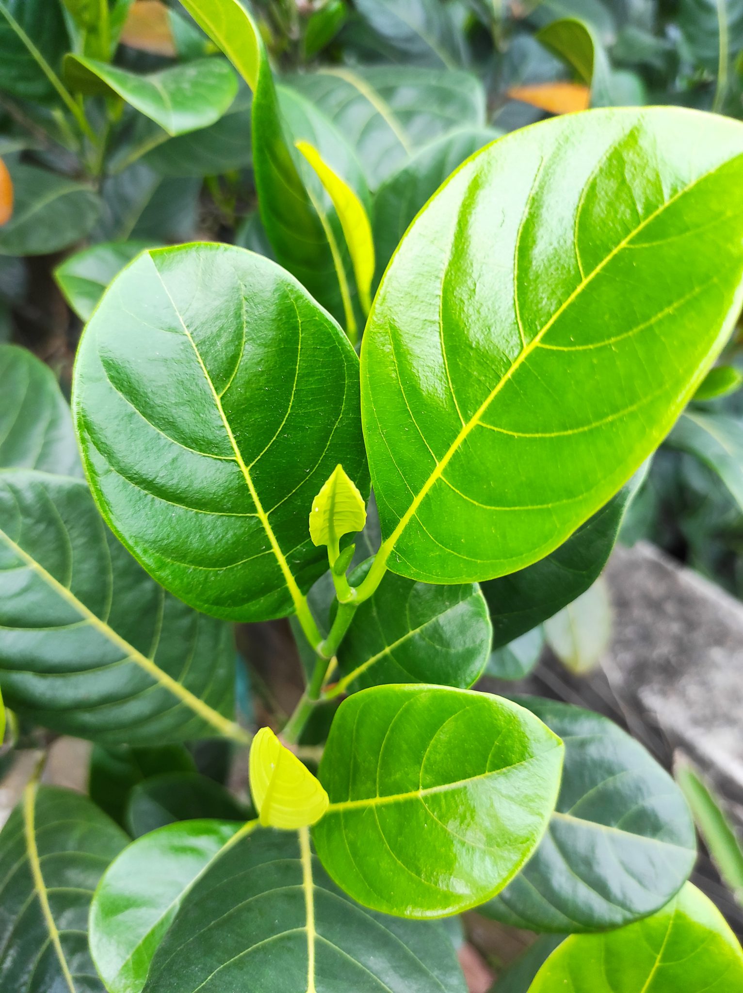 Alternative Text: Close-up of glossy green jackfruit leaves with fresh new growth, against a blurred background.