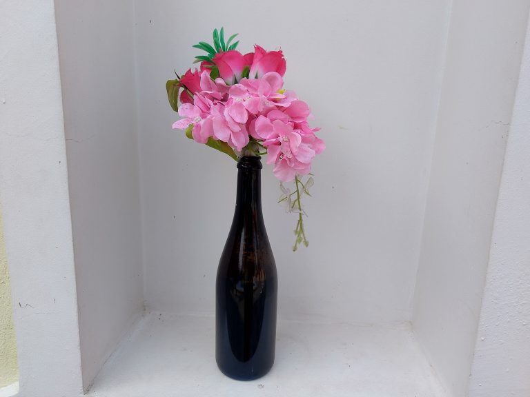 Alternative Text: A dark glass bottle is placed on a white ledge, with a cluster of artificial pink flowers and green leaves arranged in the neck of the bottle