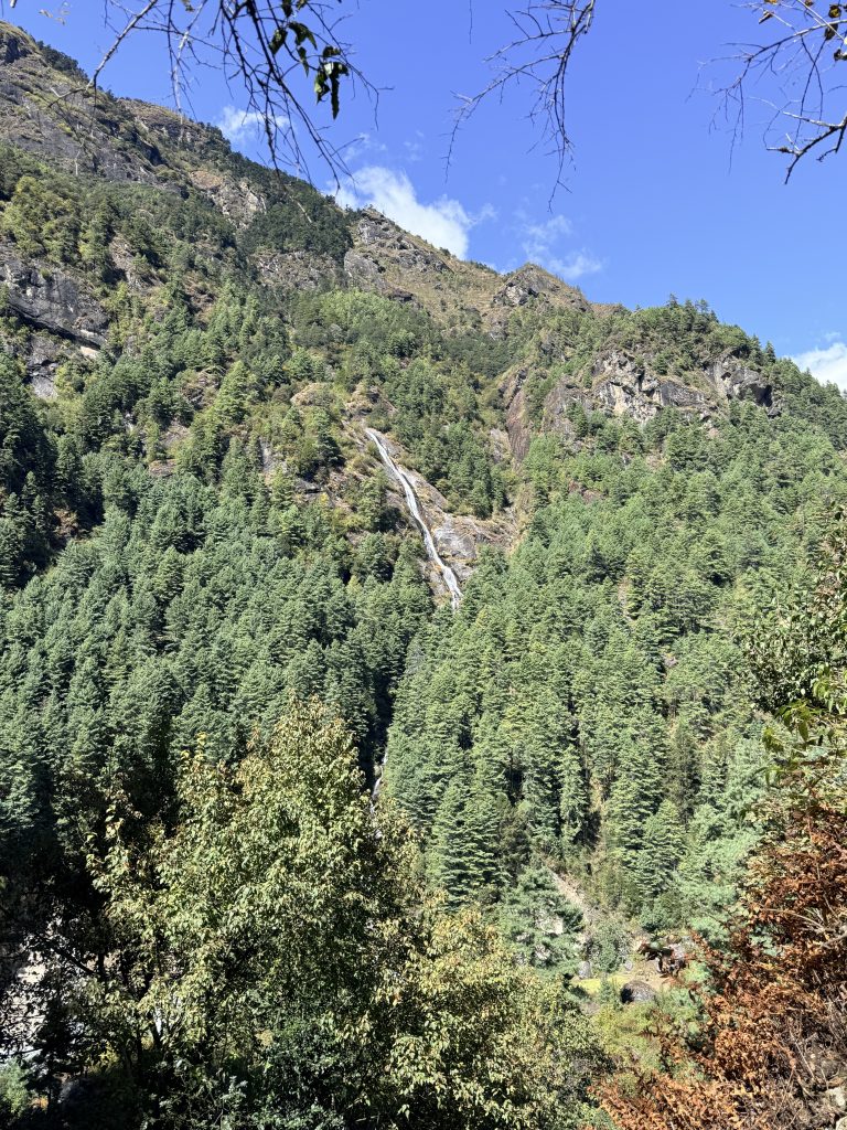 Alternative Text: A scenic view of a mountainous landscape featuring a waterfall cascading down a rocky cliff.