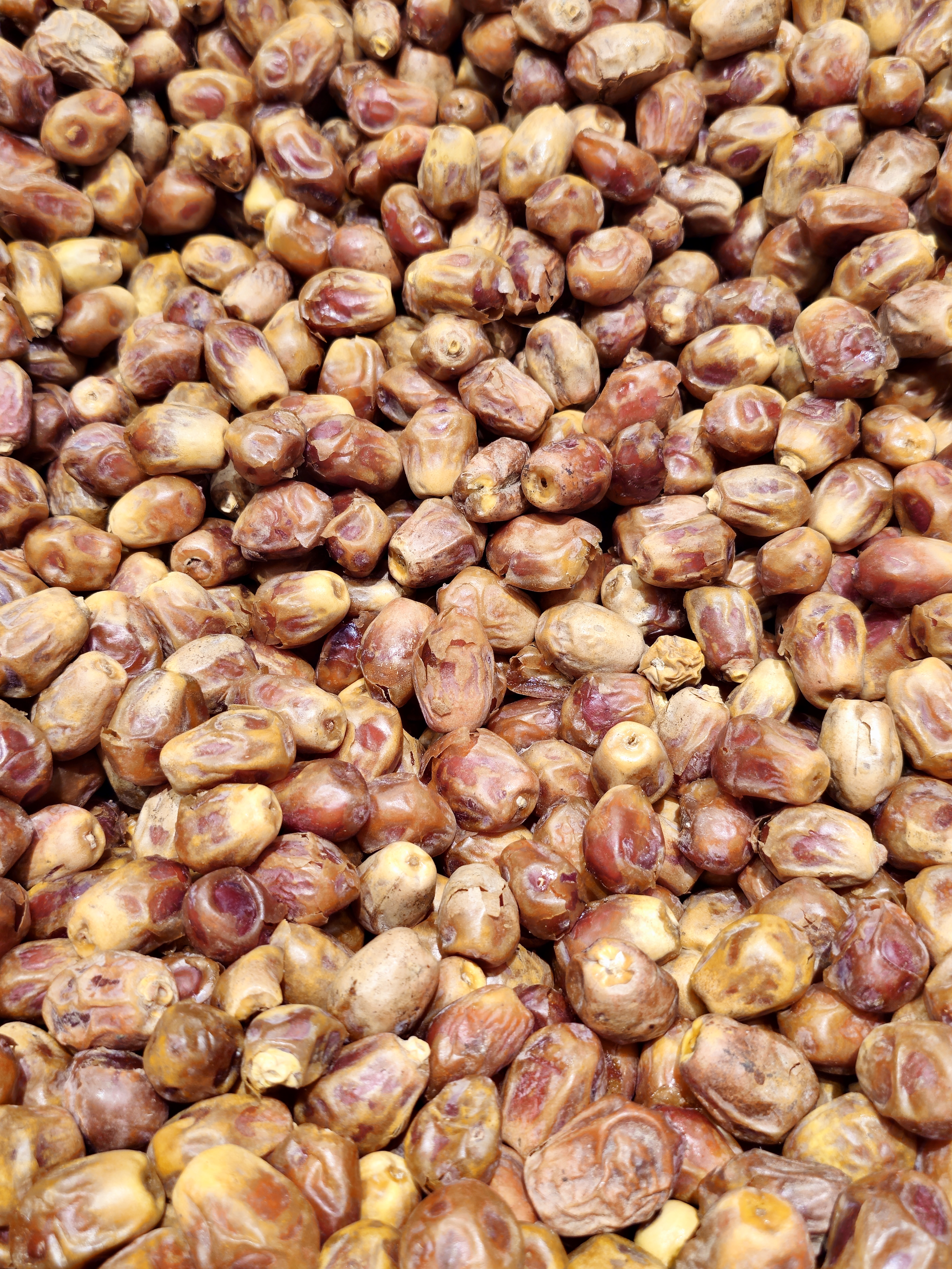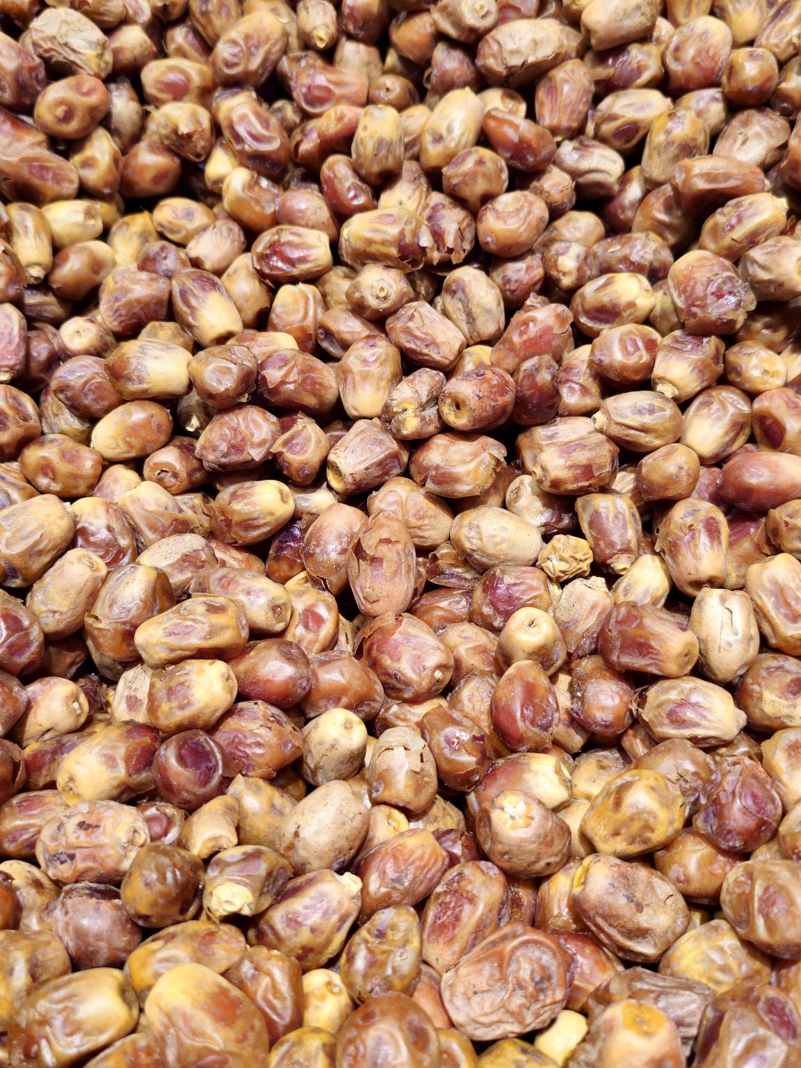 Alternative Text: A close-up view of light brown dates stacked together at a hypermarket in Kozhikode, Kerala. Their natural texture and shine show they are fresh and ready to eat.