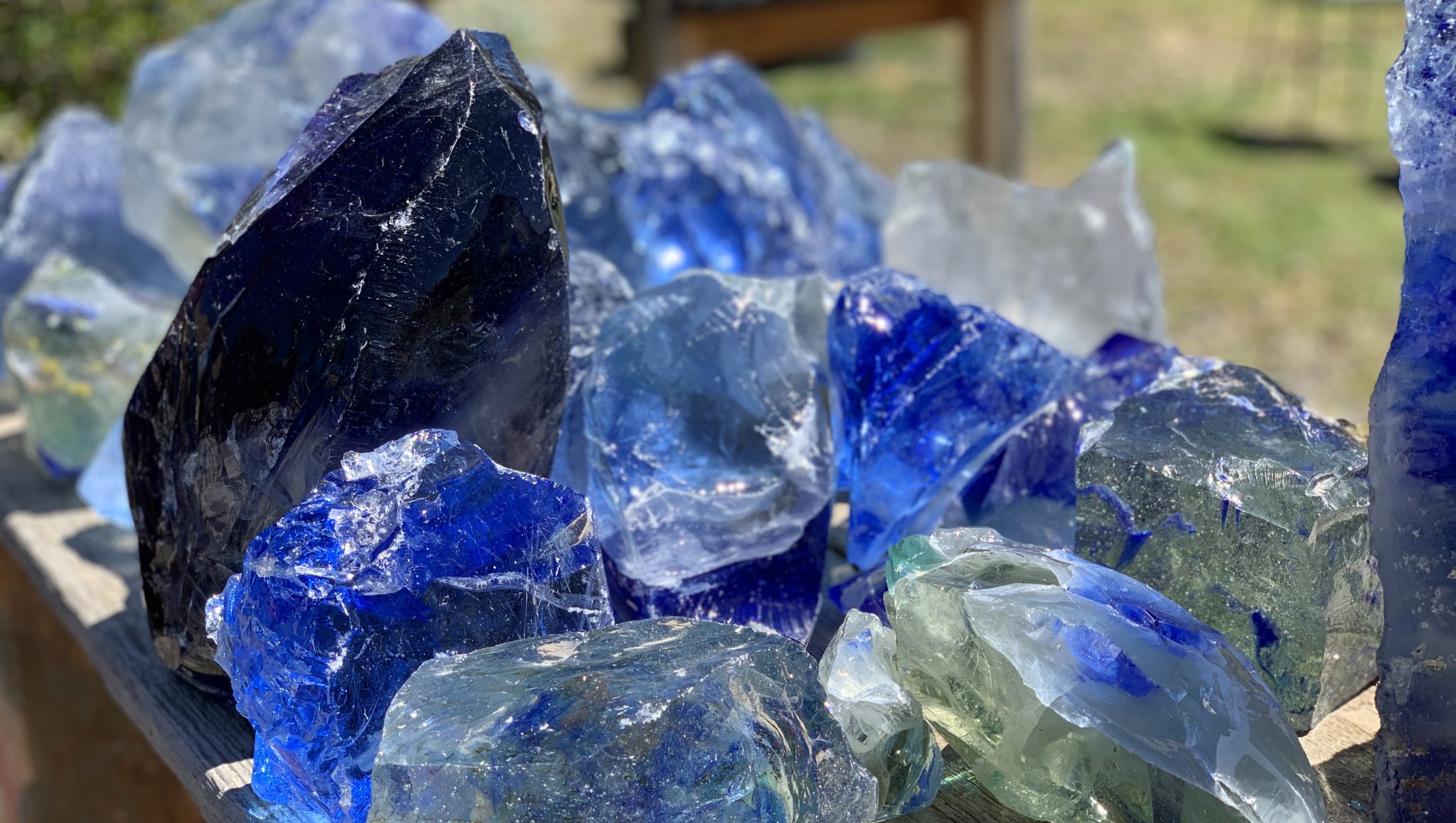Alternative Text: Pile of blue glass chunks in the sun