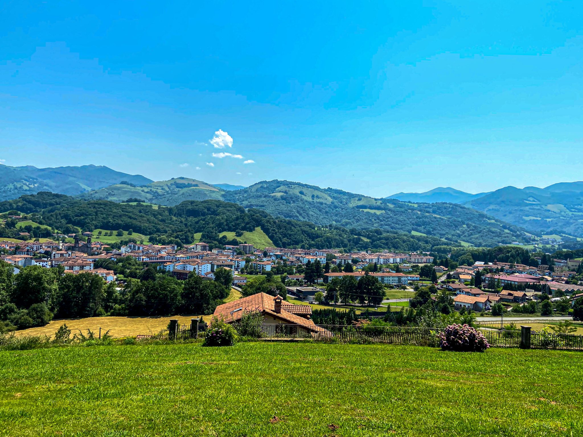 Alternative Text: A scenic landscape featuring a small town nestled among rolling hills. The foreground shows a lush green field with a few buildings, while the background is filled with verdant hills under a bright blue sky.