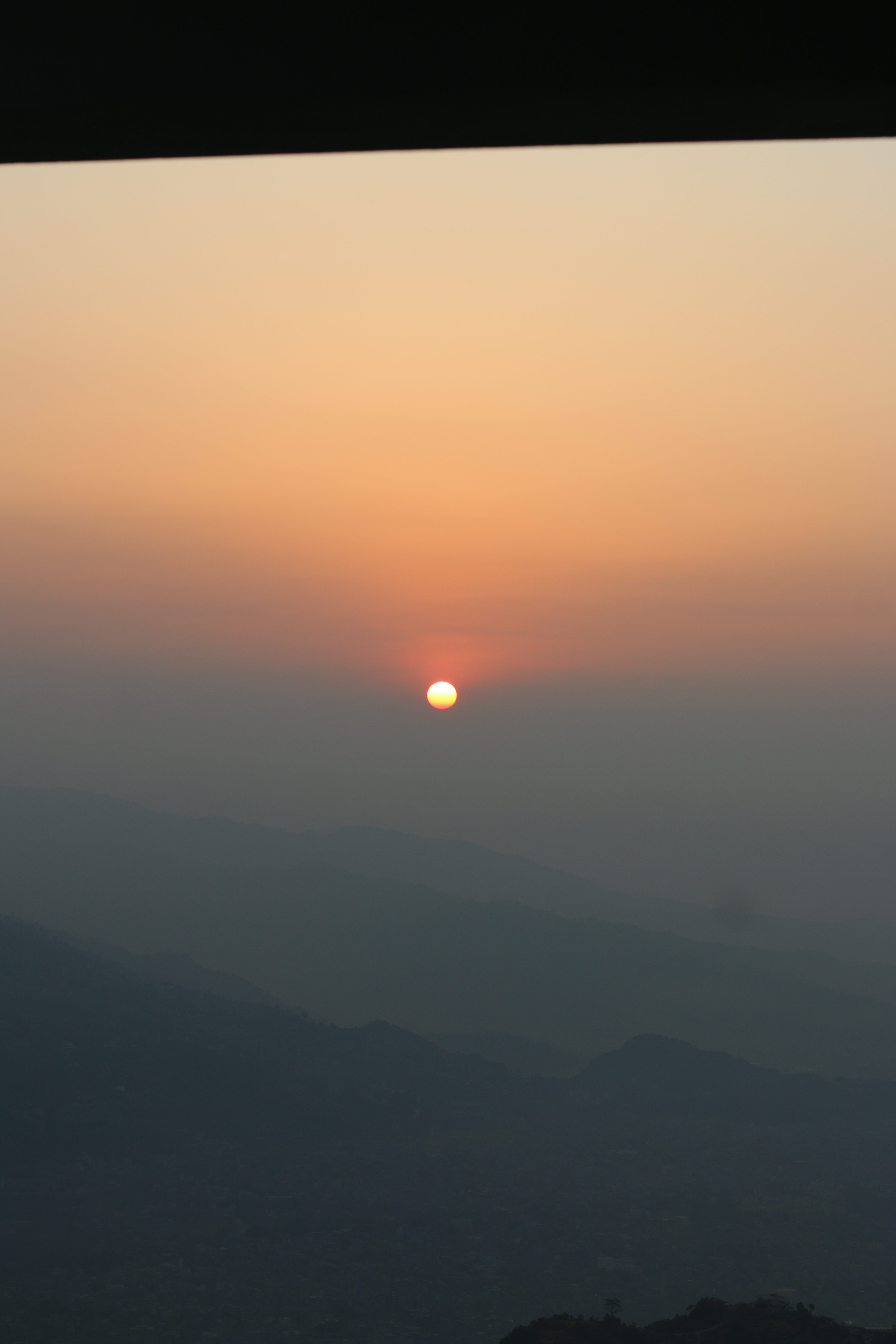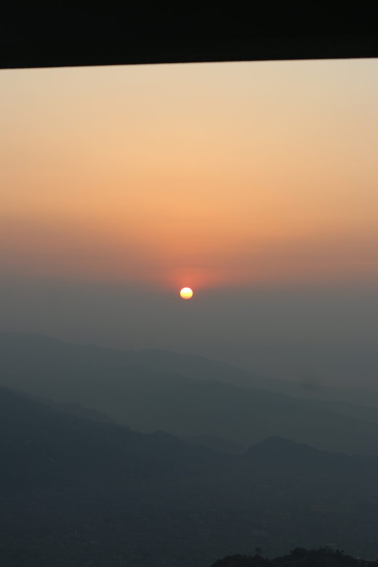 Alternative Text: A serene sunrise over a mountainous landscape, with a warm orange and pink sky.