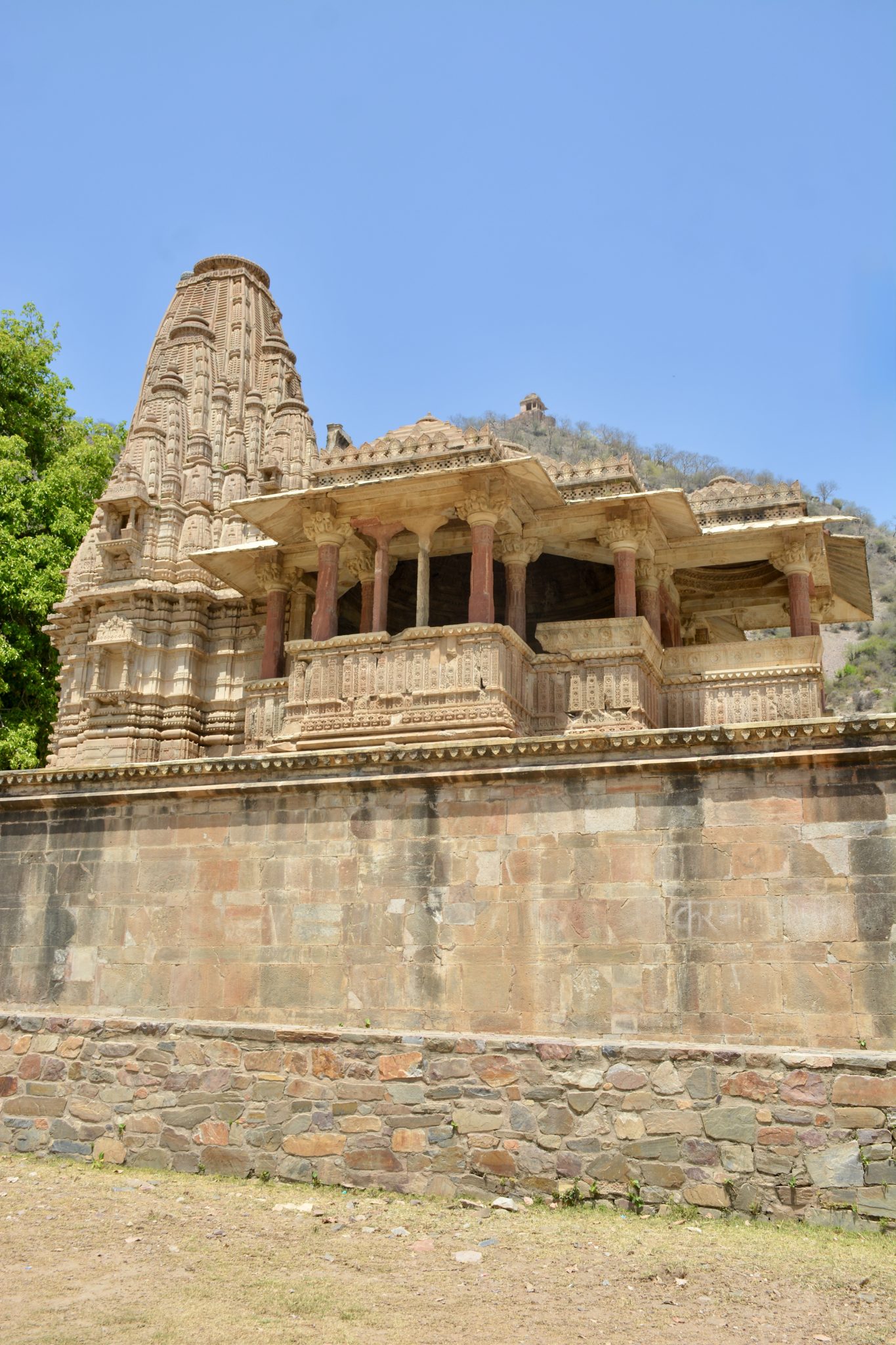 Alternative Text: Intricately carved ancient temple at Bhangarh Fort, Rajasthan, with red sandstone pillars and detailed stonework under a clear blue sky.