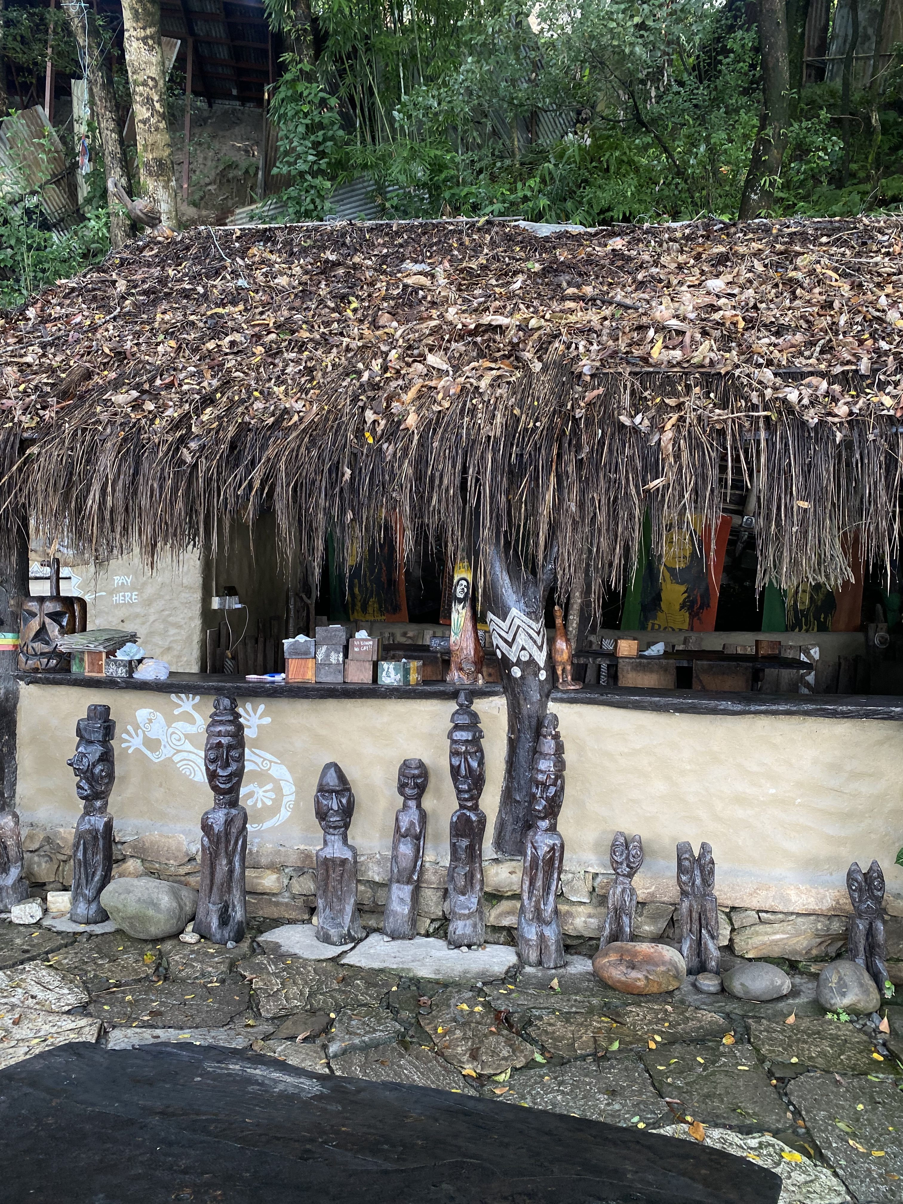 Alternative Text: A rustic outdoor setting featuring a thatched-roof structure with a wooden counter.