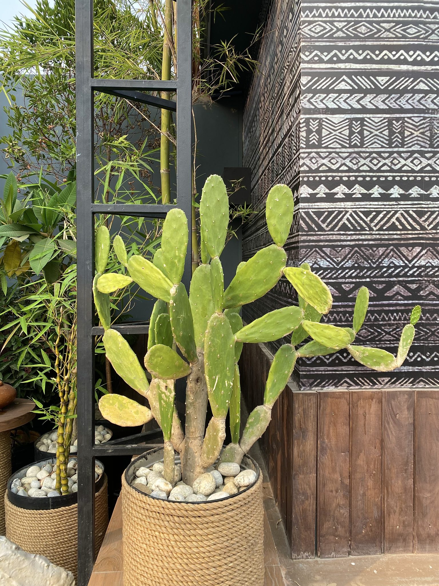 Alternative Text: A potted cactus in a woven basket near a patterned wall, surrounded by rocks with bamboo and greenery in the background.