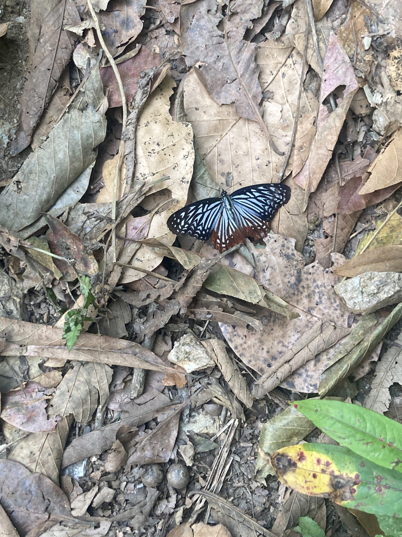 Alternative Text: A butterfly with striking blue and black wings rests on a bed of dried leaves and soil. The background is filled with various shades of brown and green foliage, creating a natural and earthy scene.