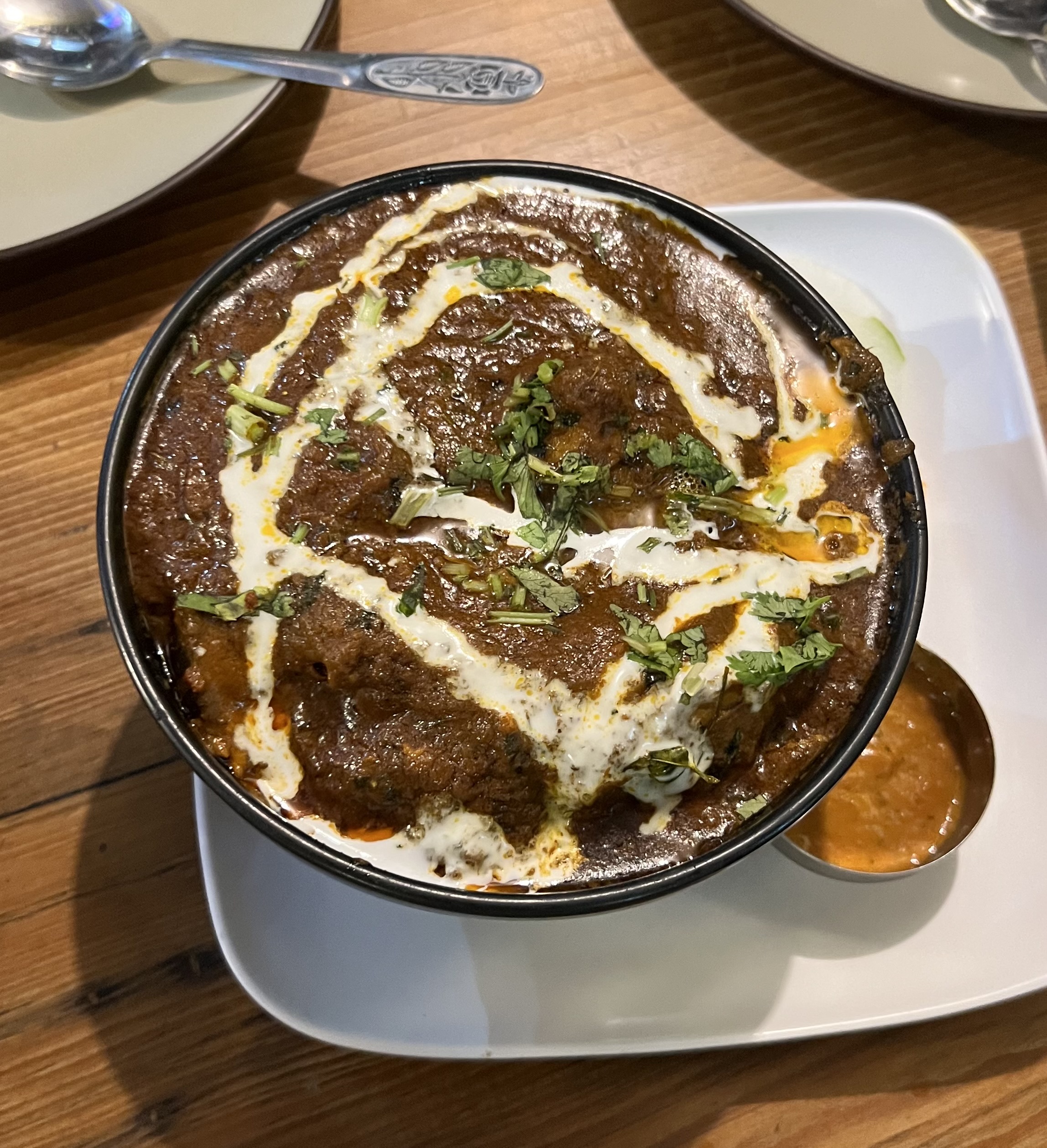 Alternative Text: Bowl of dark brown Mutton curry with yogurt swirls and chopped green herbs.
