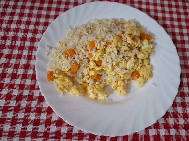 Alternative Text: Scrambled eggs with white rice, carrots, and diced chicken on a white plate atop a red-and-white tablecloth.