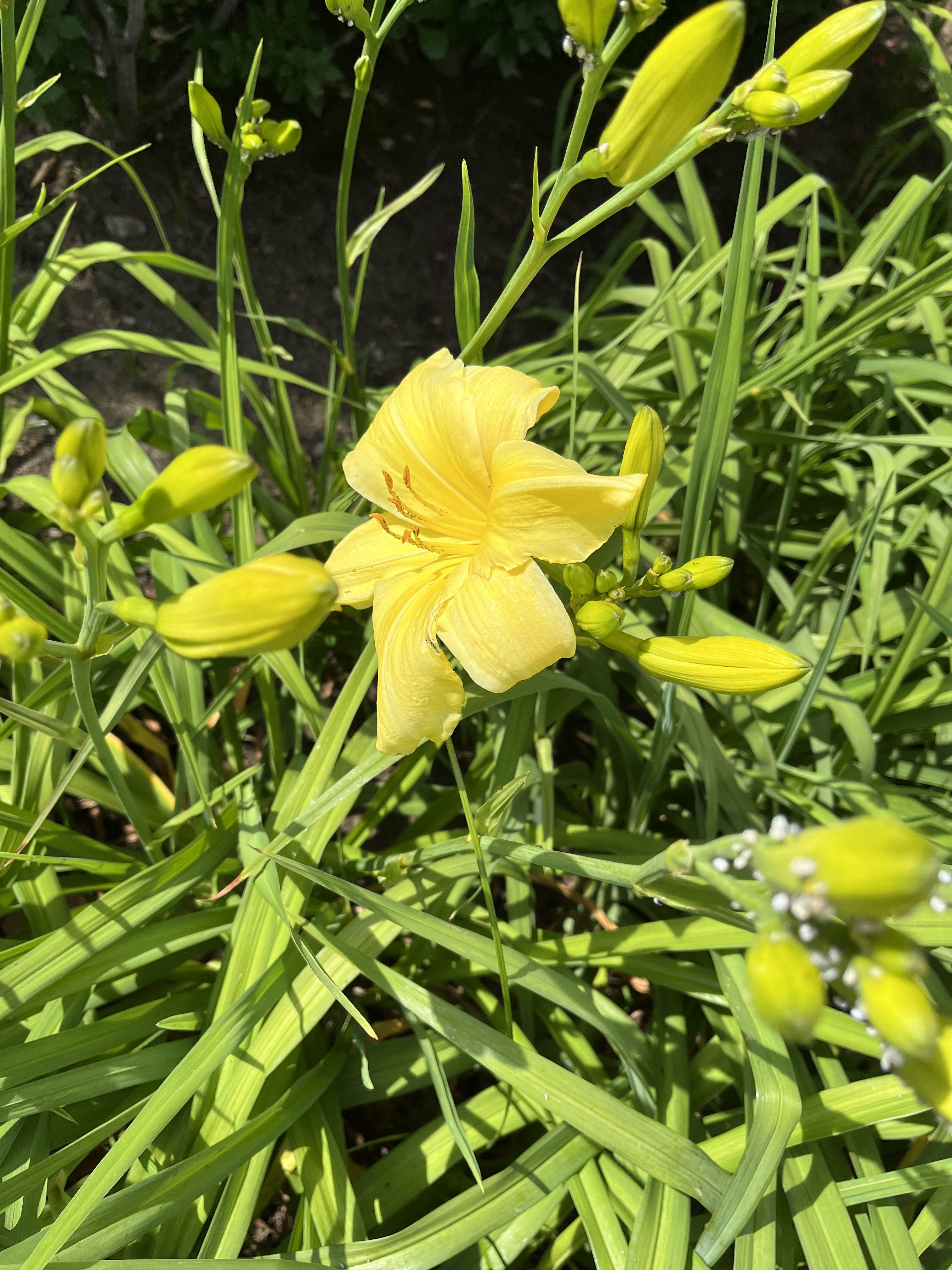Alternative Text: A vibrant yellow flower blooms among lush green foliage.