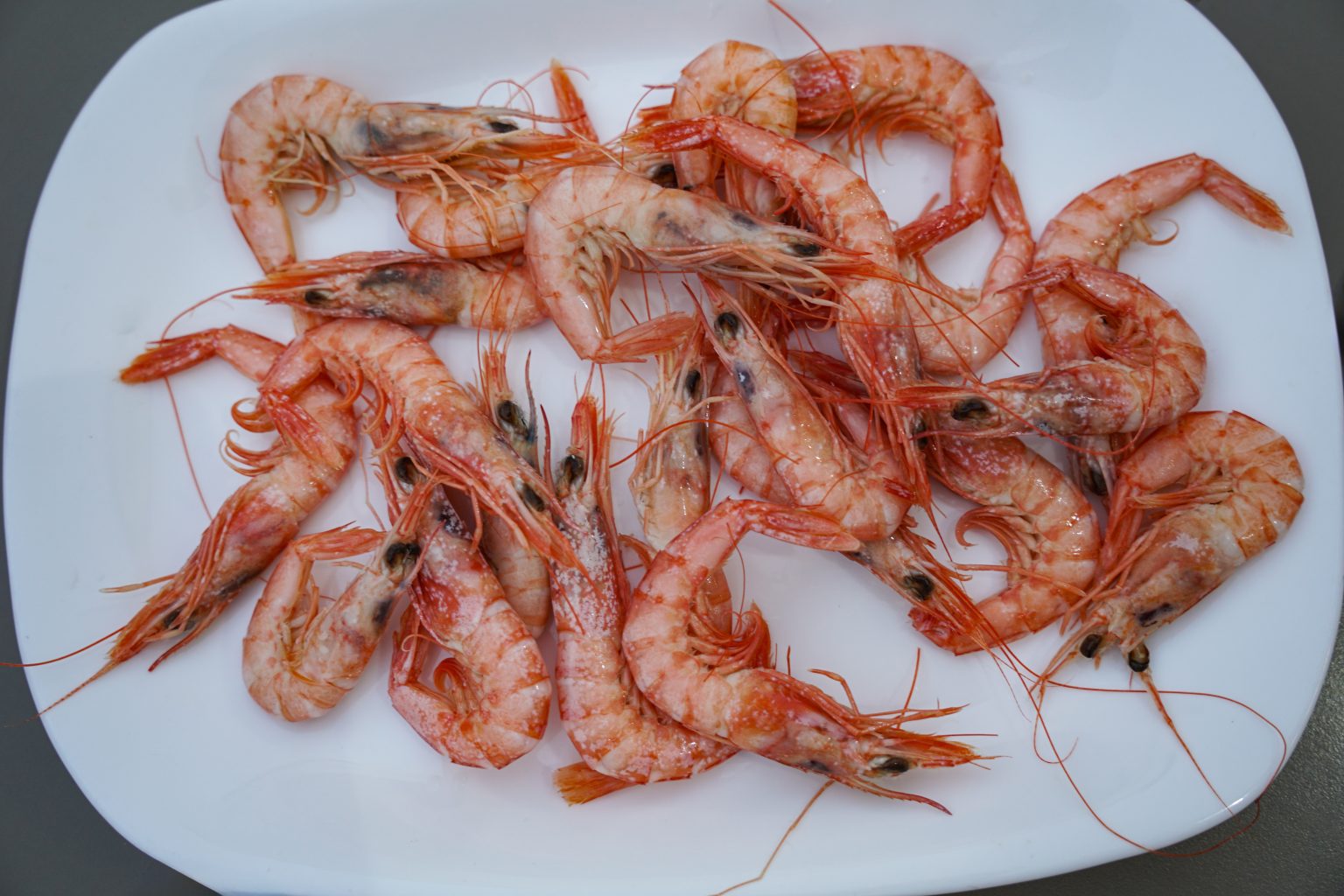 Alternative Text: A white plate is filled with a generous serving of cooked, pink shrimp. The shrimp are arranged haphazardly, showcasing their curved bodies and long antennae.