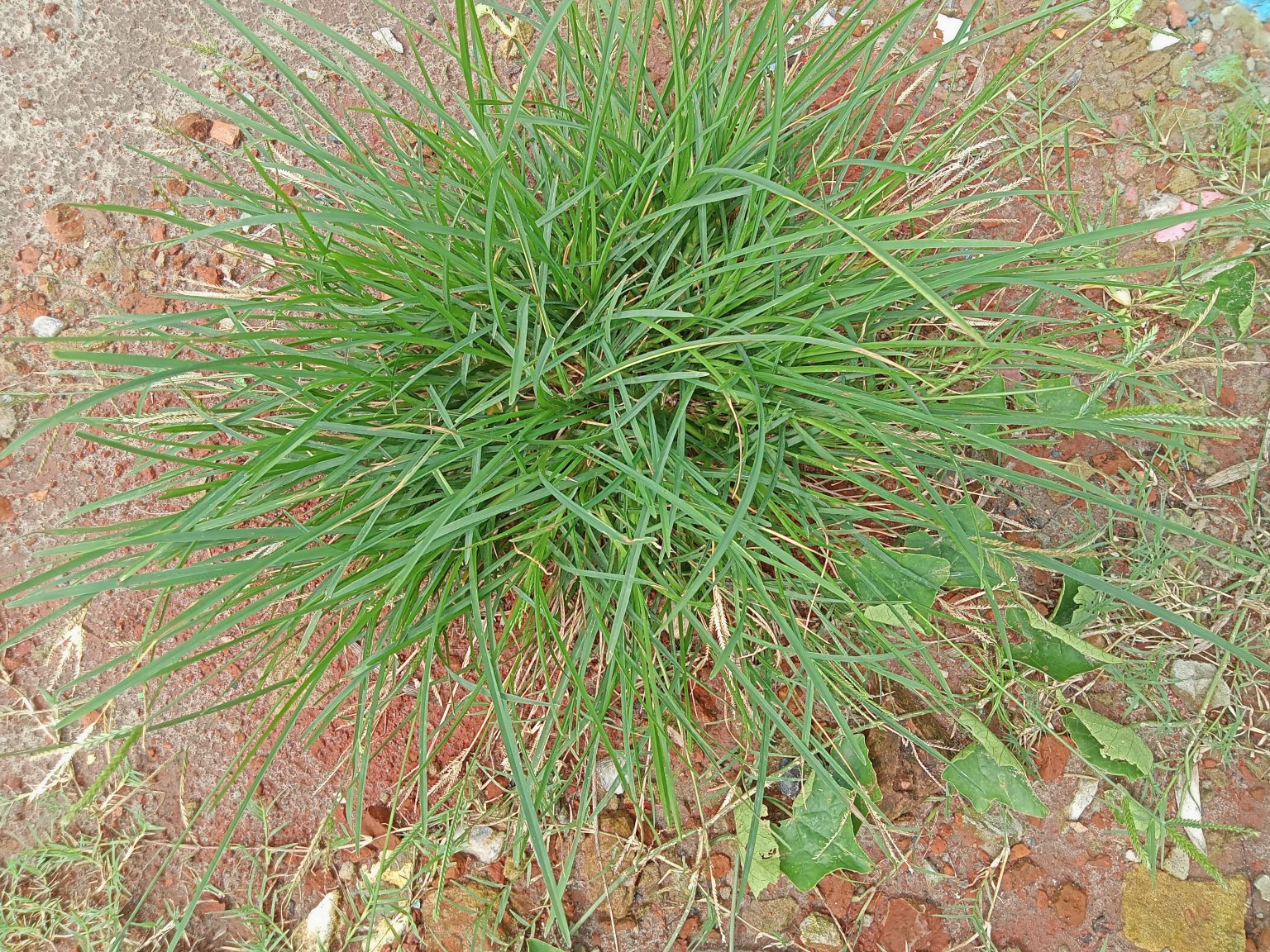 Alternative Text: A dense cluster of green grass and leafy plants growing on a reddish-brown soil surface, with some scattered small stones and bits of debris in the background.