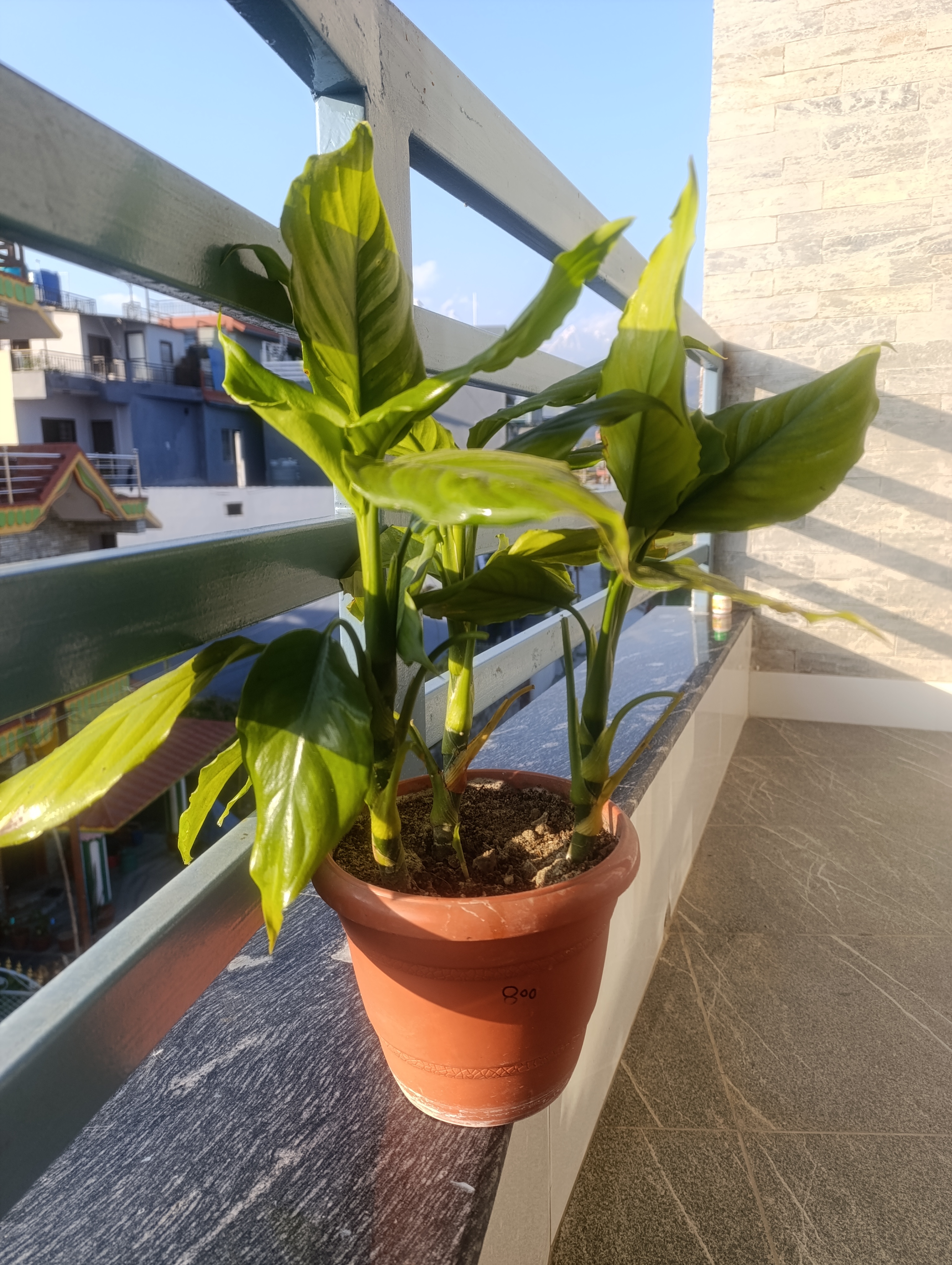 Alternative Text: A potted green plant with vibrant leaves sits on a balcony railing, basking in sunlight.