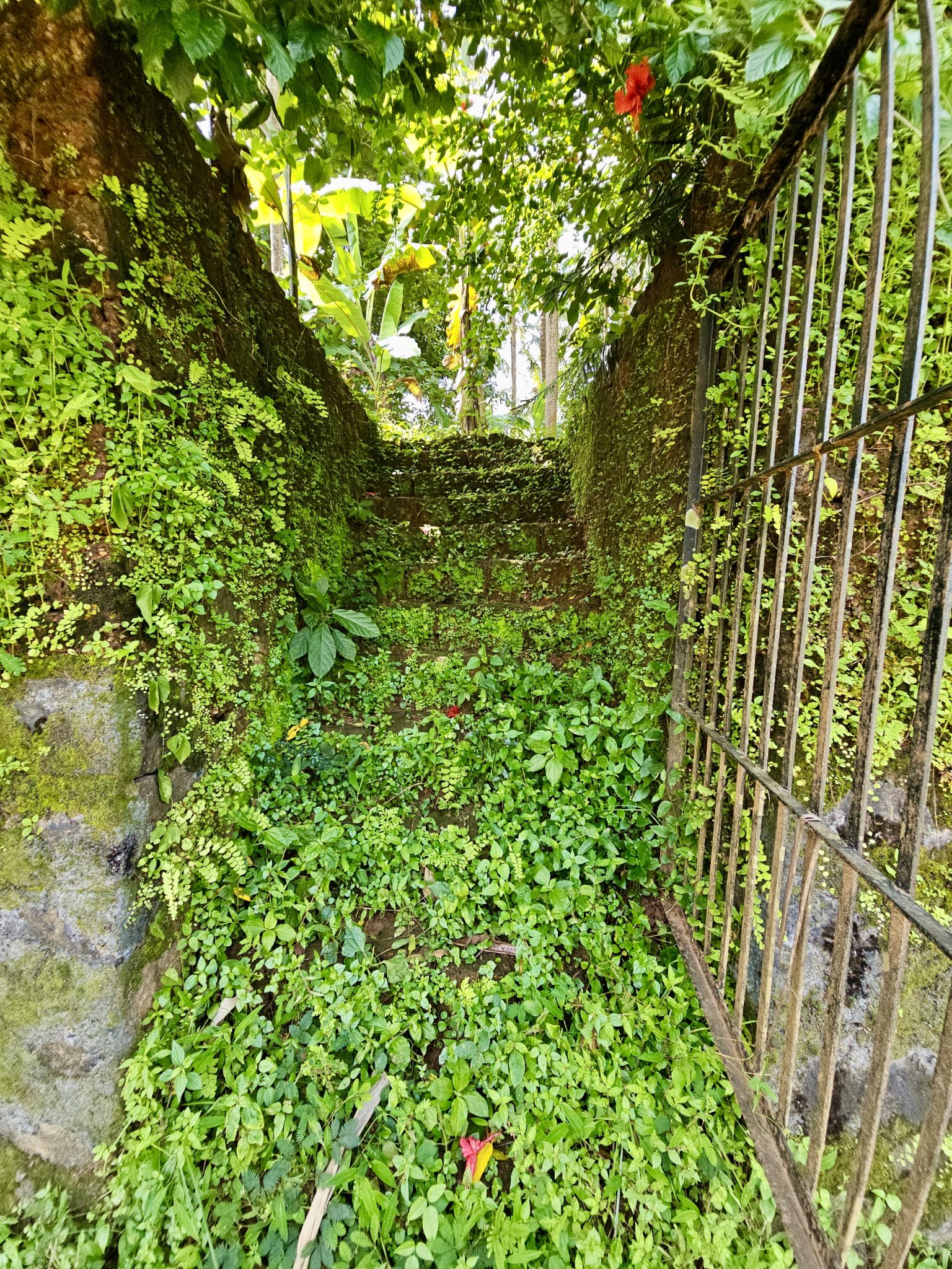 Alternative Text: Stone steps covered in moss and wild plants create a magical path through this lush green corner. Captured from Puttekadavu, Perumanna, Kozhikode.