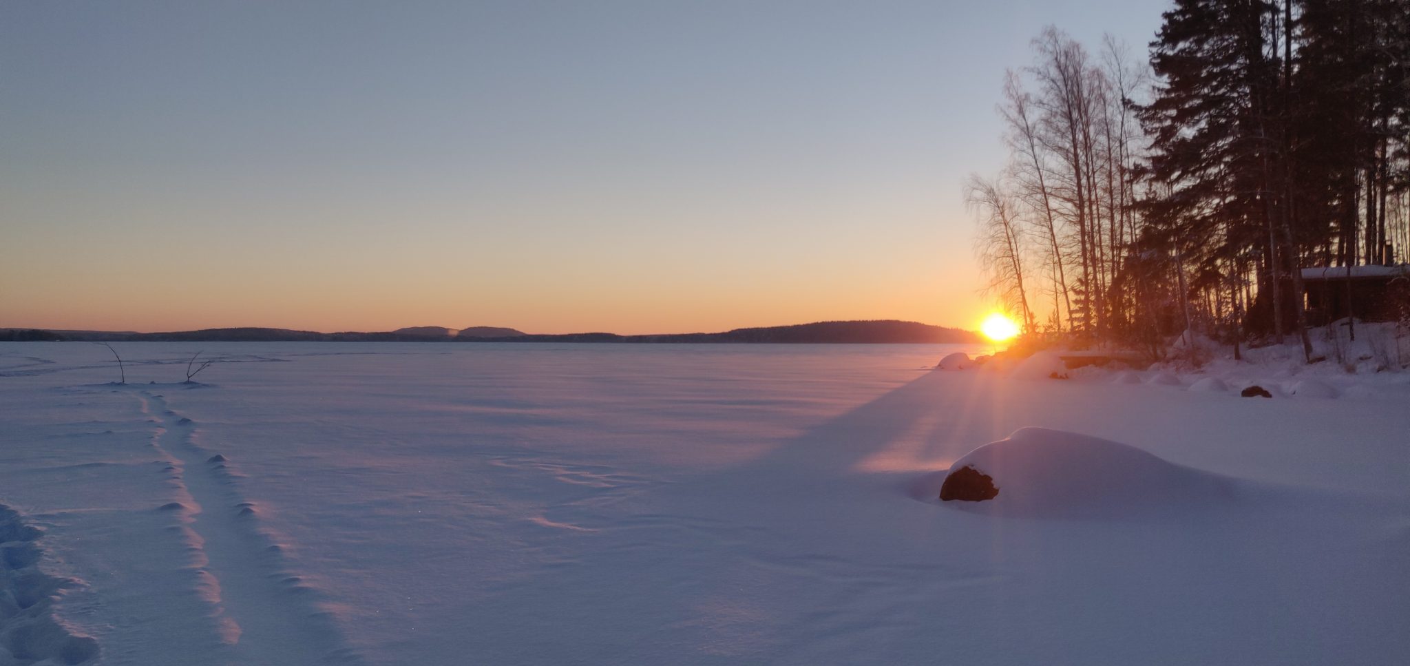 Alternative Text: Sunset and snow over frozen lake view