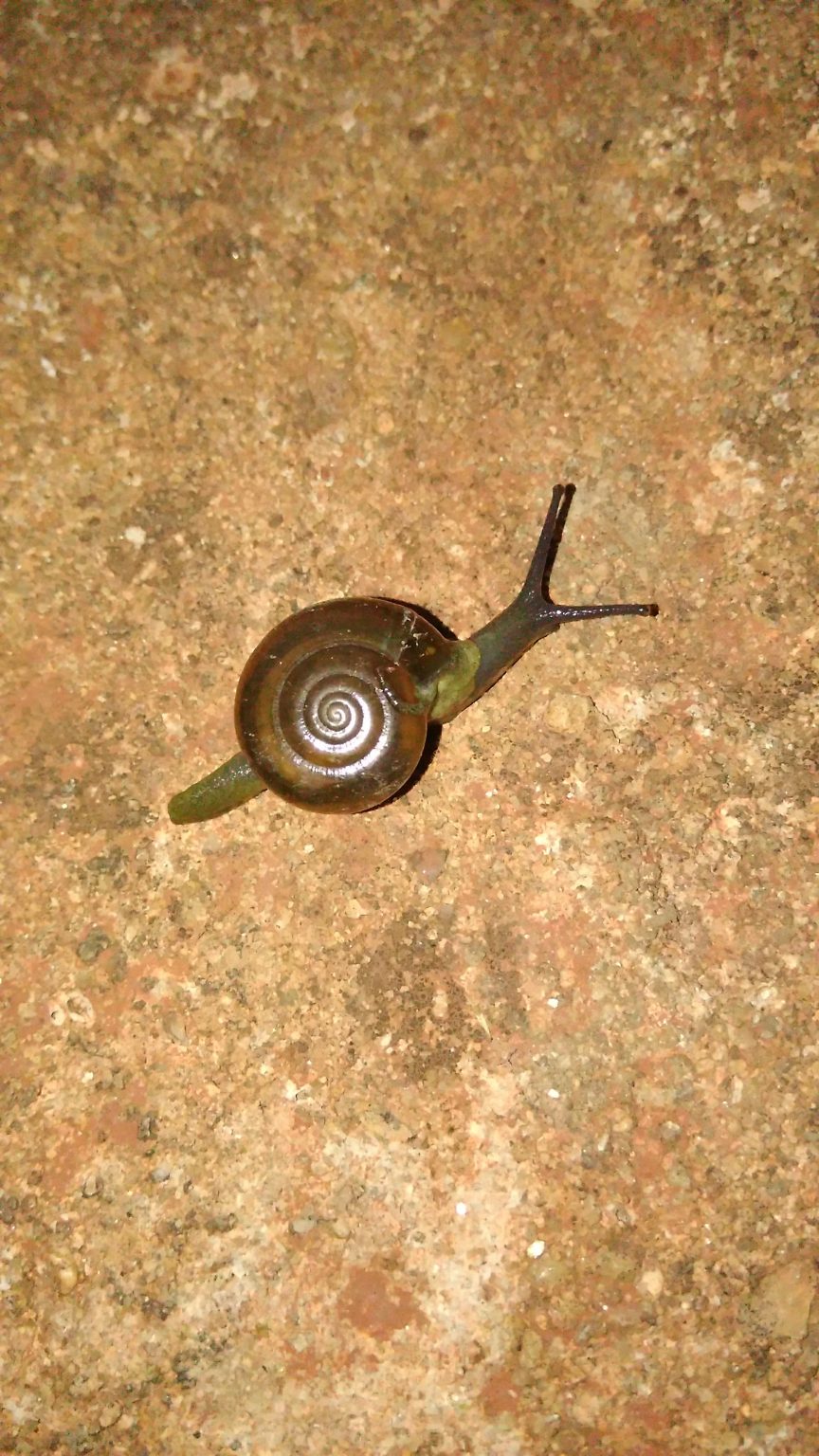 Alternative Text: A close-up image of a small brown snail with a spiral shell, moving on a textured, earthy surface.