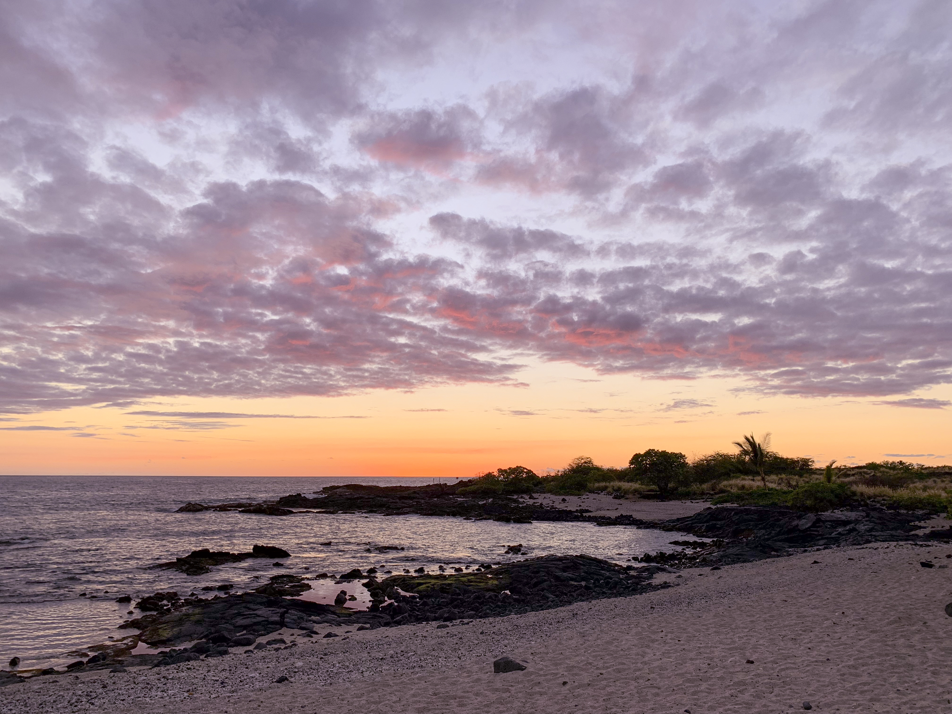 Alternative Text: A wide-angle shot of a vibrant orange, pink, and purple sunset over Kailua Beach, Hawaii, with a rocky volcanic shore, sandy beach, and the Pacific Ocean stretching into the distance under cotton candy clouds.