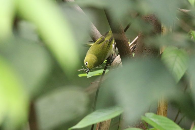 Alternative Text: An Ashy-bellied White-eye collecting nesting materials.