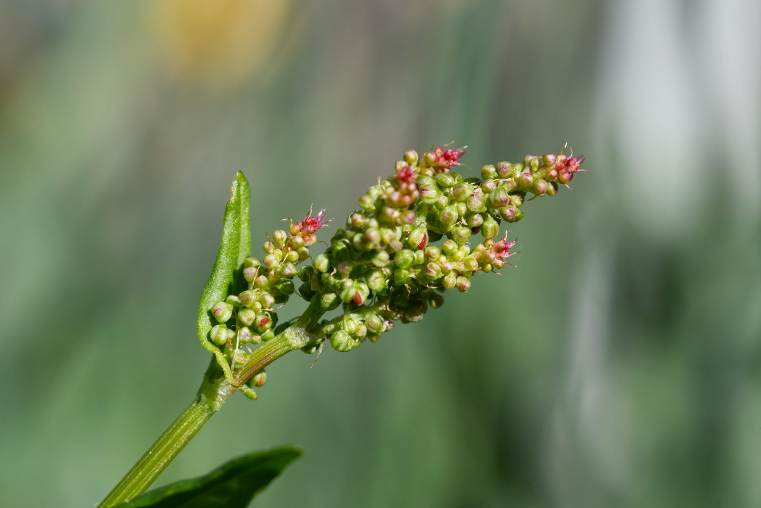 Alternative Text: Small red flowers of sorrel (Rumex acetosa) against a green, blurred background