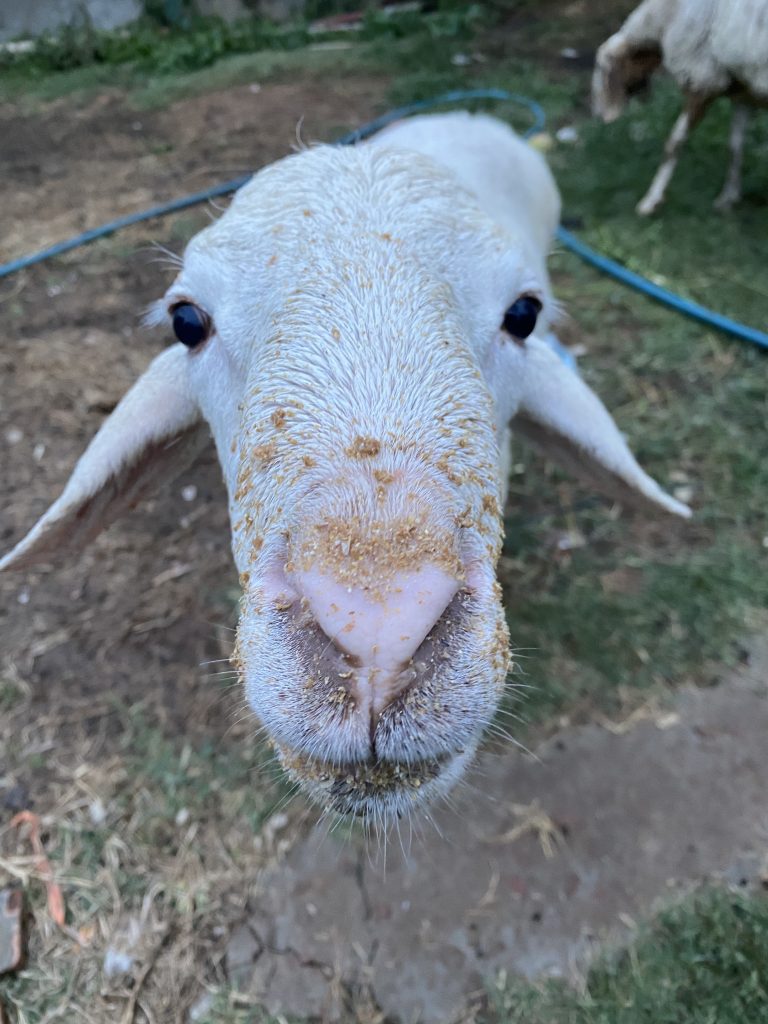 Alternative Text: Close-up of a sheep with a muddy nose and curious expression. The background shows grass, dirt, and another sheep, conveying a rustic farm setting.