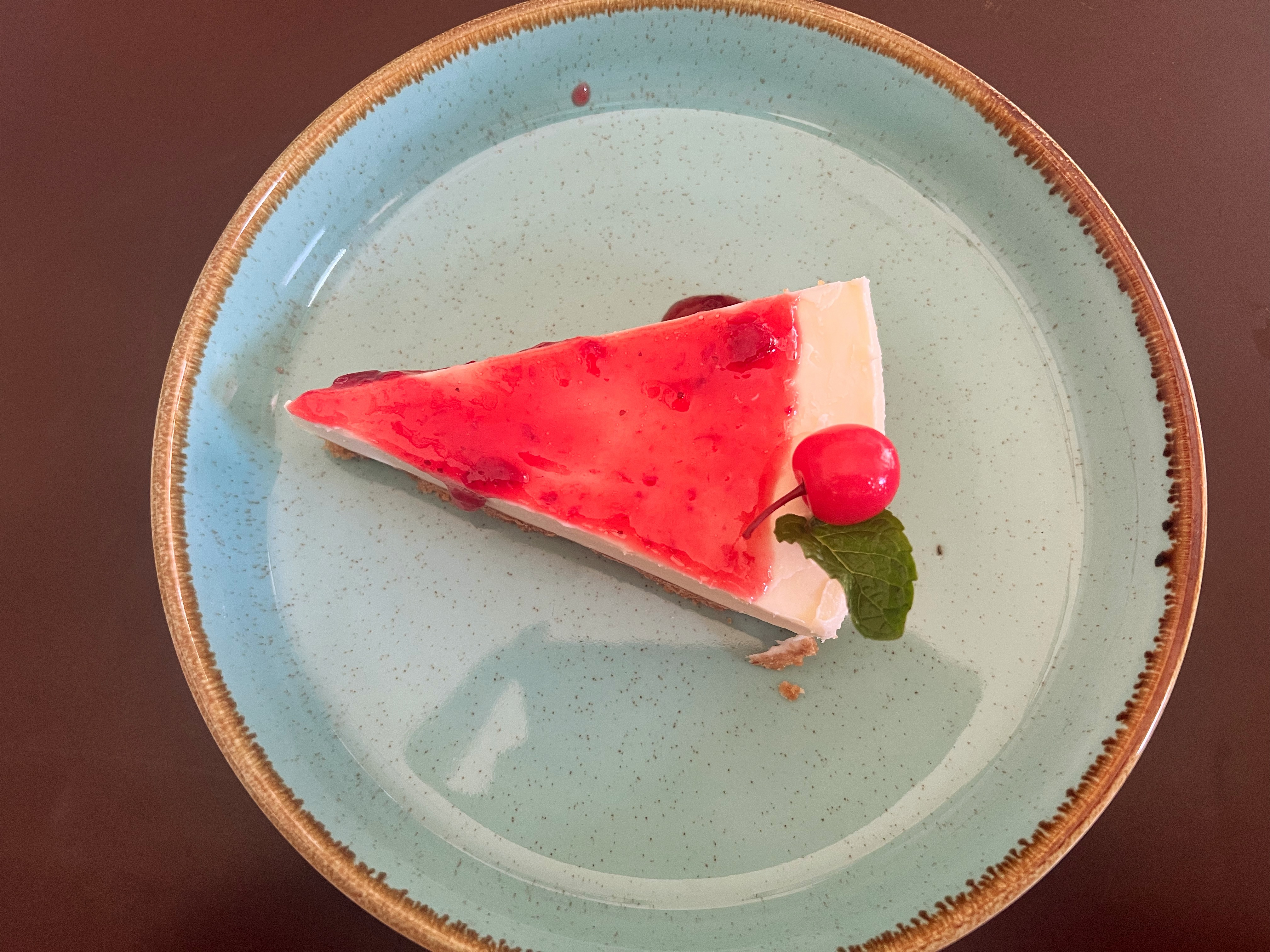 Alternative Text: A slice of strawberry cheesecake with red fruit topping, a cherry, and a mint leaf sits on a light blue plate.