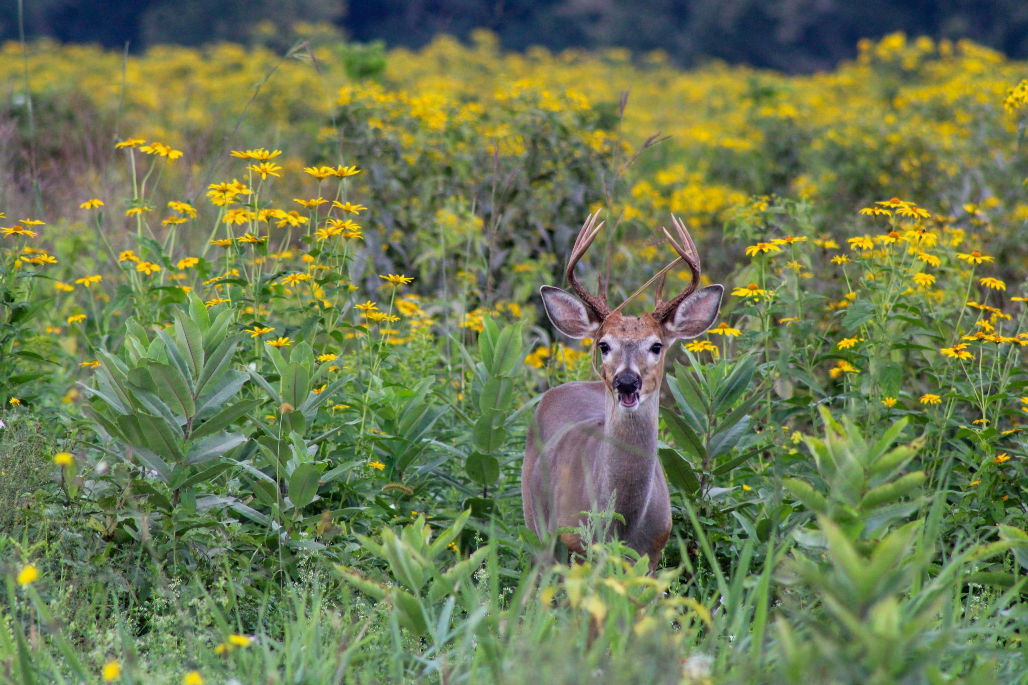 Alternative Text: An 8-point buck looks up from a field of flowers.
