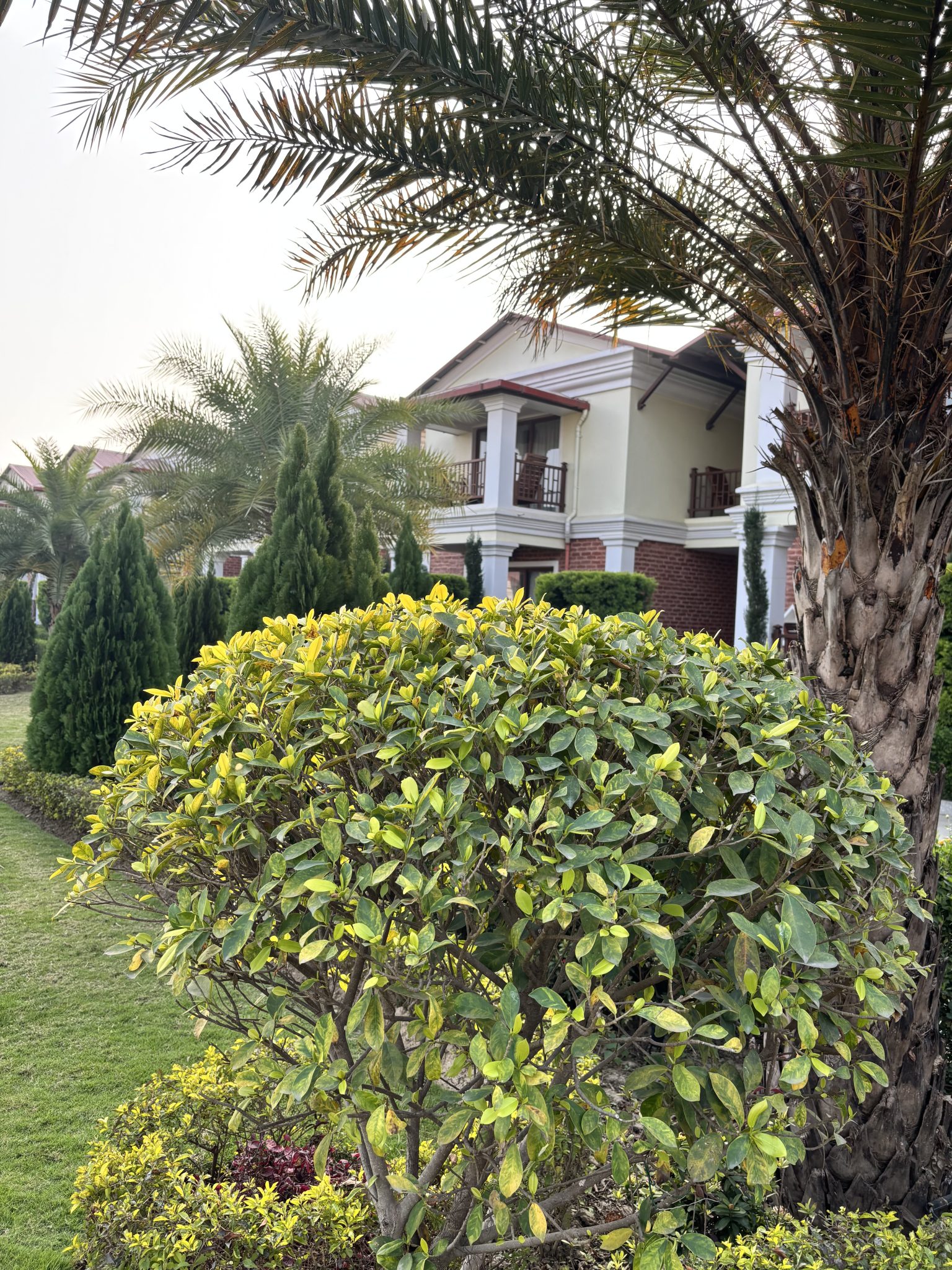Alternative Text: A landscaped garden featuring a variety of lush greenery, including a well-maintained shrub with yellow-tipped leaves in the foreground. Behind the shrub, there are tall coniferous trees and several palm trees.