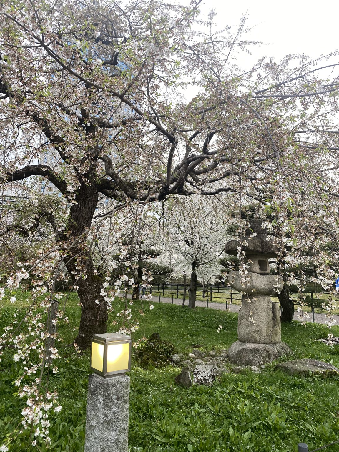 Alternative Text: A serene park scene featuring a large, flowering cherry blossom tree draped with delicate pink and white blossoms. In the foreground, a softly glowing lantern sits on a stone pedestal, surrounded by lush green grass. Behind the tree, other cherry blossom trees can be seen, creating a tranquil atmosphere. A winding pathway is visible in the background.