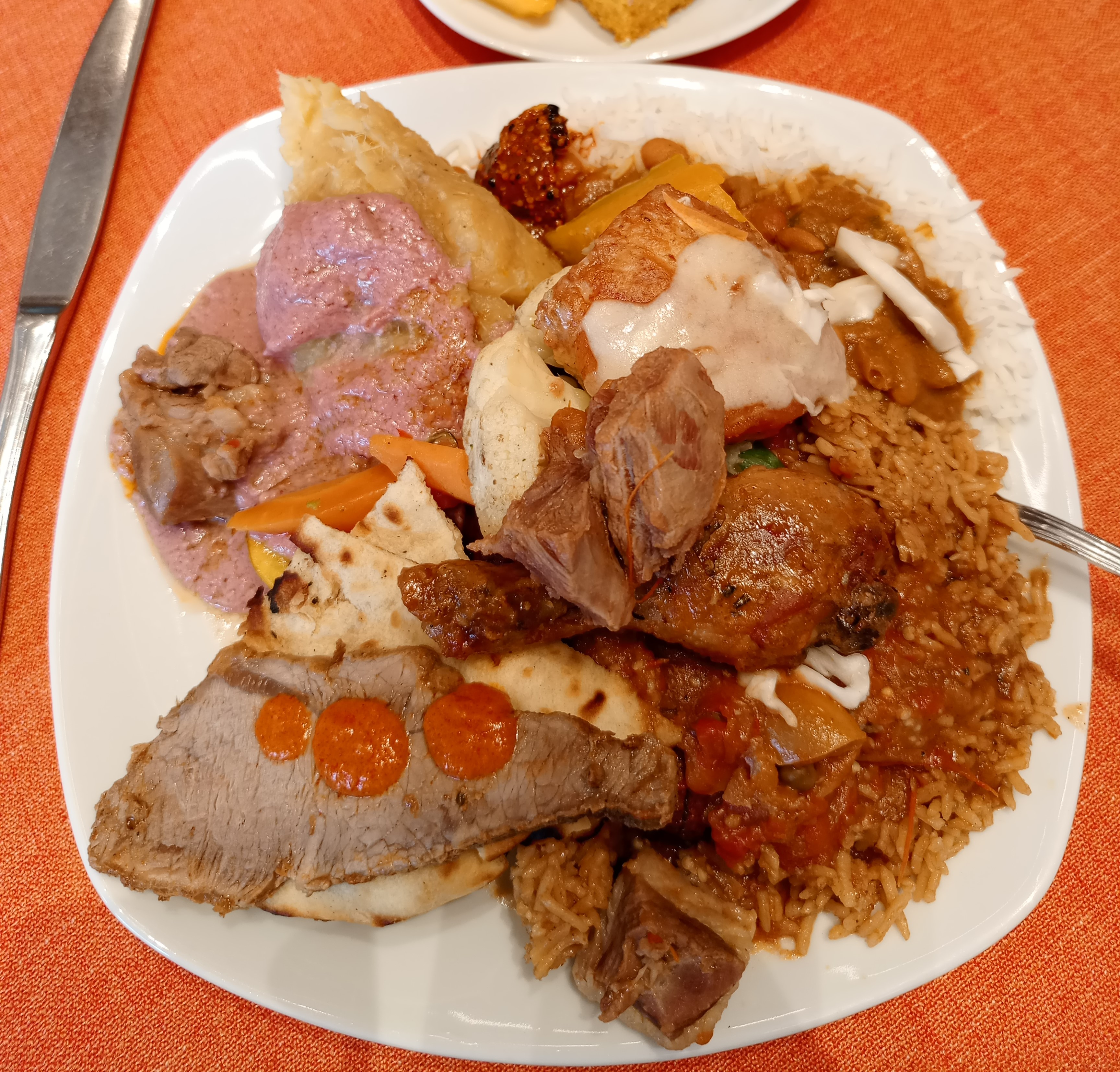 Alternative Text: Top-down view of a white plate with roast beef in red sauce, grilled chicken, seasoned rice, flatbread, and steamed vegetables, served on an orange textured tablecloth.