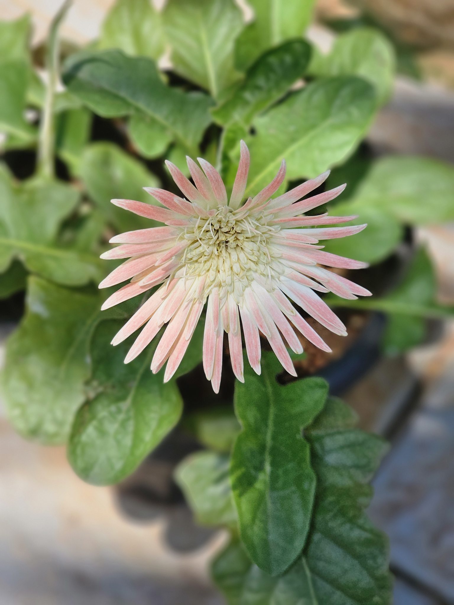 Alternative Text: A close-up of a light pink and white Gerbera daisy in full bloom, with its petals radiating outwards from a textured center. The flower is set against a backdrop of lush green leaves. Captured from my cousin’s garden in Kozhikode, Kerala.
