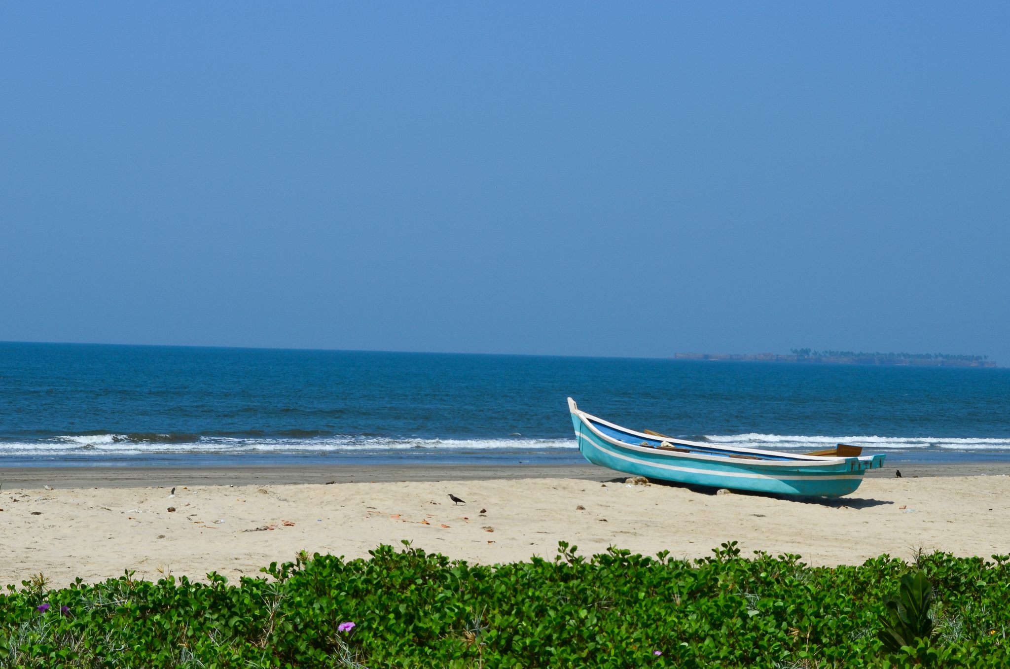 Alternative Text: A serene beach with a blue-and-white boat on the sand and gentle waves in the background.