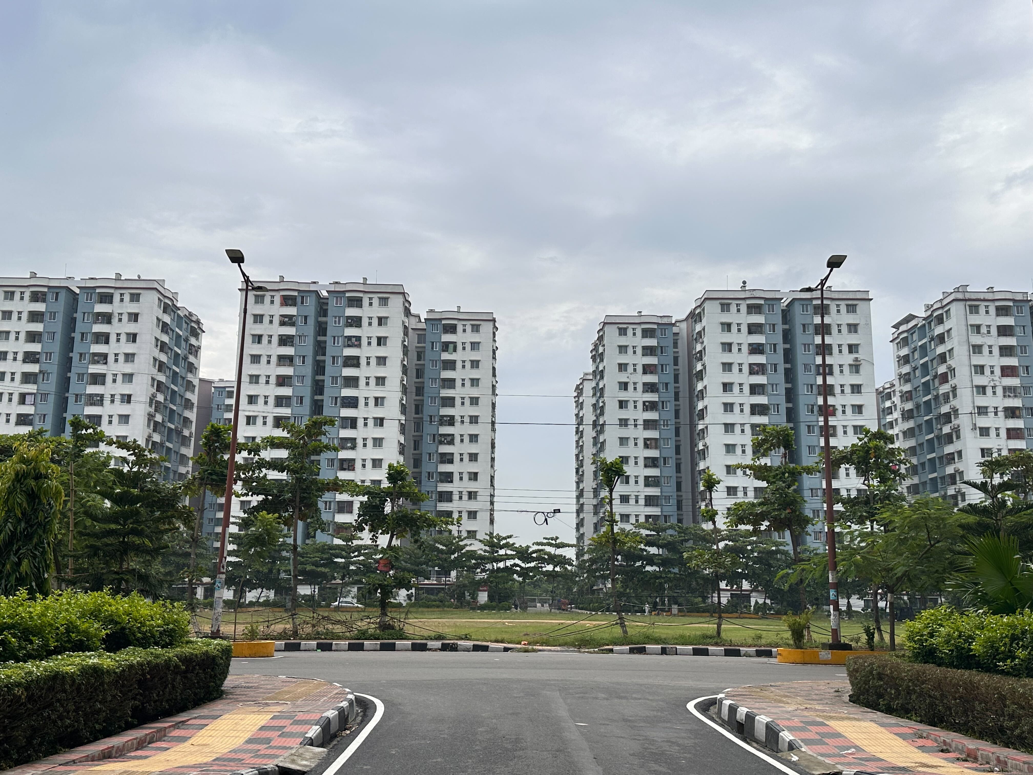 Alternative Text: A view of a modern residential area in Dhaka, featuring several tall apartment buildings with white and light blue exteriors.