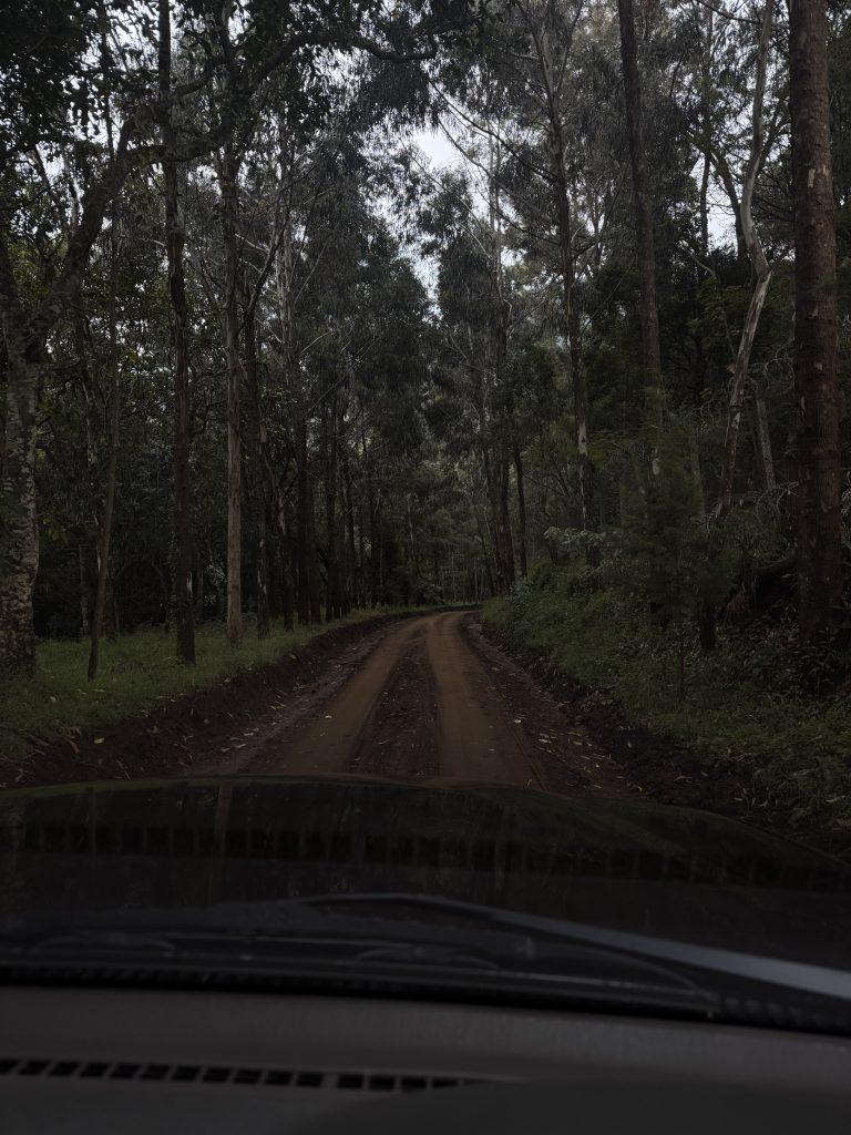Alternative Text: A dark, dirt road winds through a dense forest of tall, thin trees. The view is from a car’s dashboard, with the sky looking cloudy and gray.