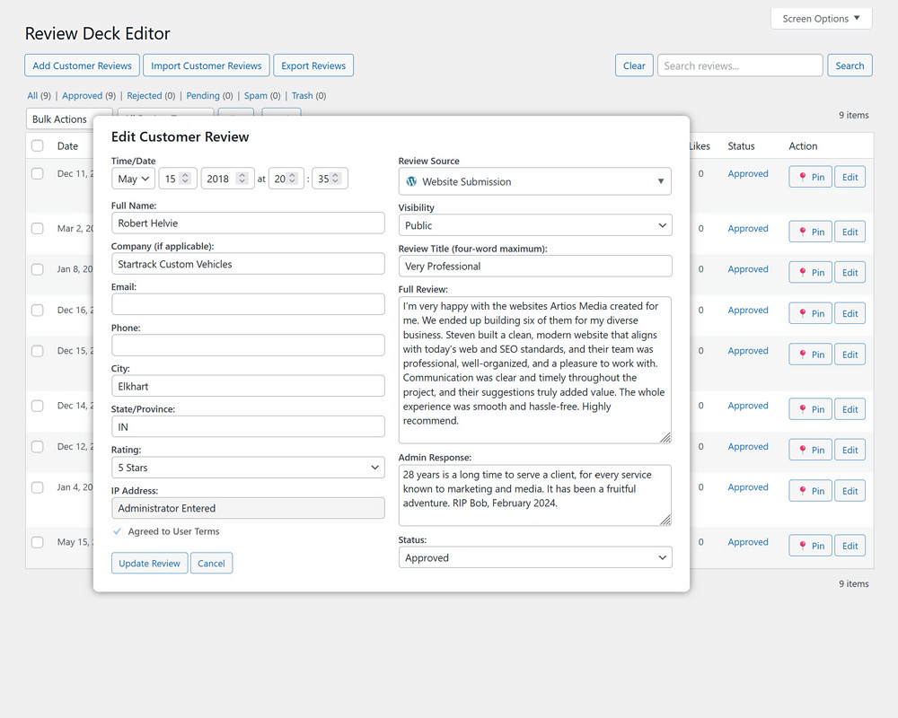 Review Deck offers enterprise-level features typically found only in premium solutions. Respond to reviews publicly with admin replies to show customers you care about their feedback. Pin your best testimonials to the top of your review list. Professional spam protection includes Akismet integration, honeypot fields, and Google reCAPTCHA v3.