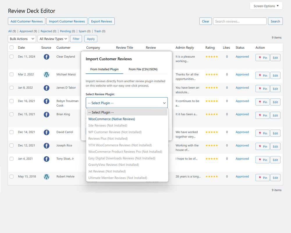 Manage reviews from a clean admin interface. Pin your best reviews to the top, reply to reviews publicly, and use bulk actions to approve, reject, or trash multiple reviews at once. Filter reviews by type (page, post, or product) and status (Approved, Pending, Rejected, or Trash). Edit any review field, including author, rating, or content. Set custom time/date stamps for reviews and control visibility (Public, Password-Protected, or Private) to manage when and how reviews appear. Monitor review likes from the admin table. Import from Site Reviews, WP Customer Reviews, CSV, or JSON files.