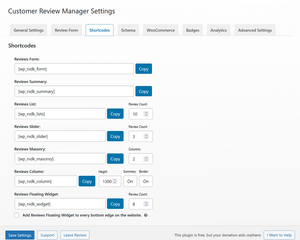 – [wp_rvdk_widget] for a floating review widget