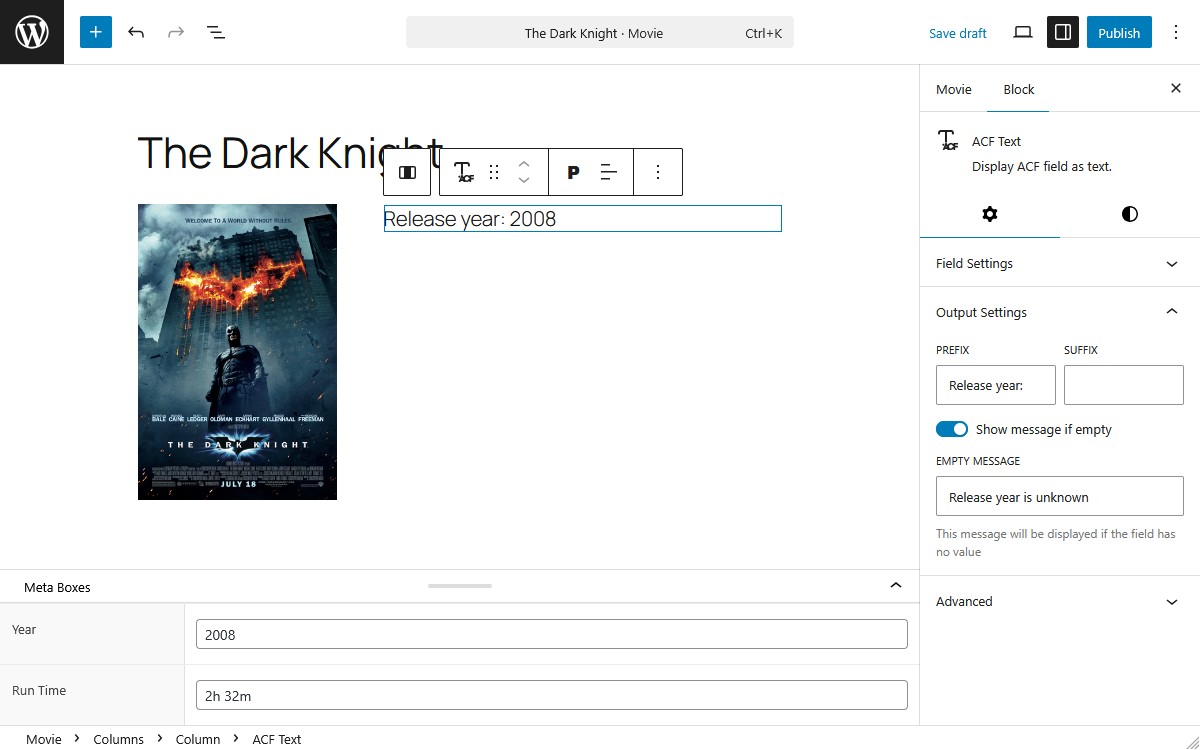 - No Code Needed – Display your ACF & SCF fields directly in the editor without building a custom block.