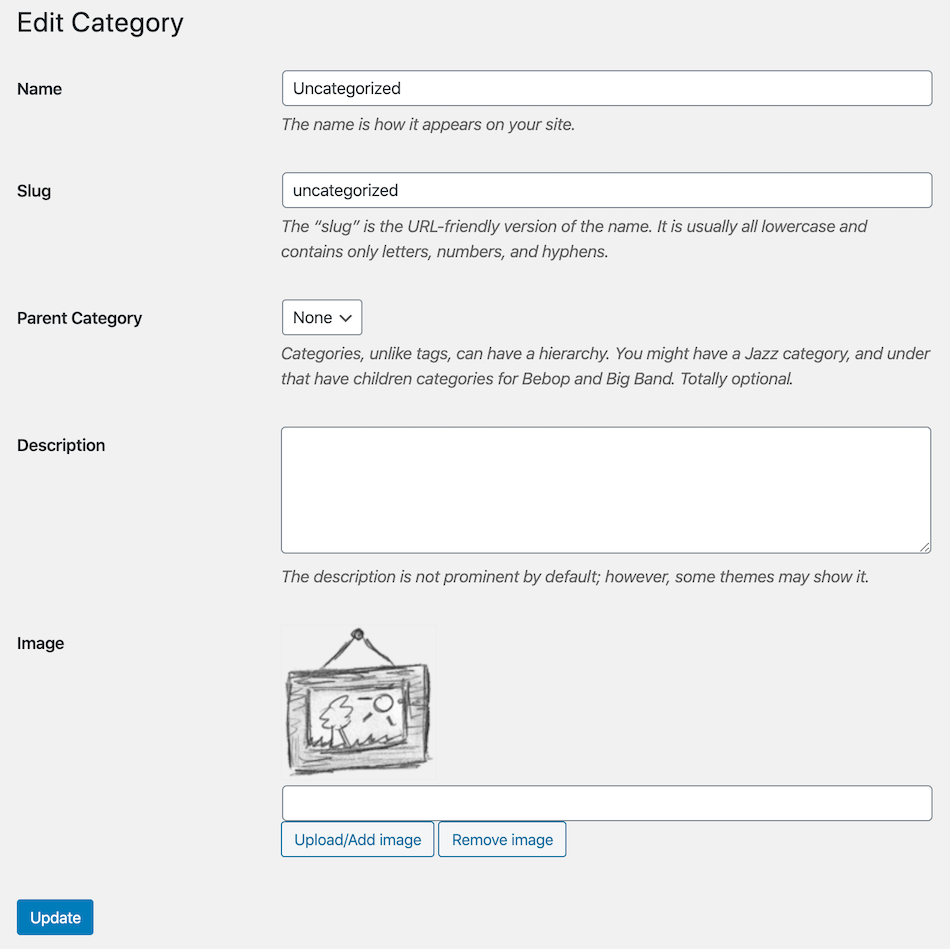 Image preview and new image field in add/edit category or taxonomy with upload button which allow you to select current or upload a new image.