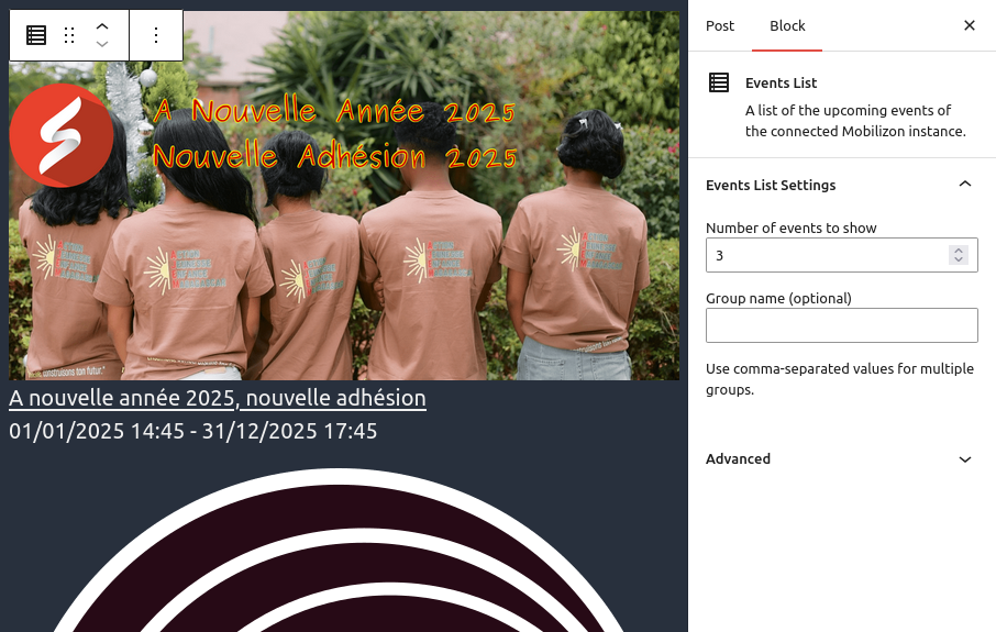 Optionally, you can only show the events of one or more groups by indicatings their names: [connector-mobilizon-events-list events-count=3 group-name="mygroup"]