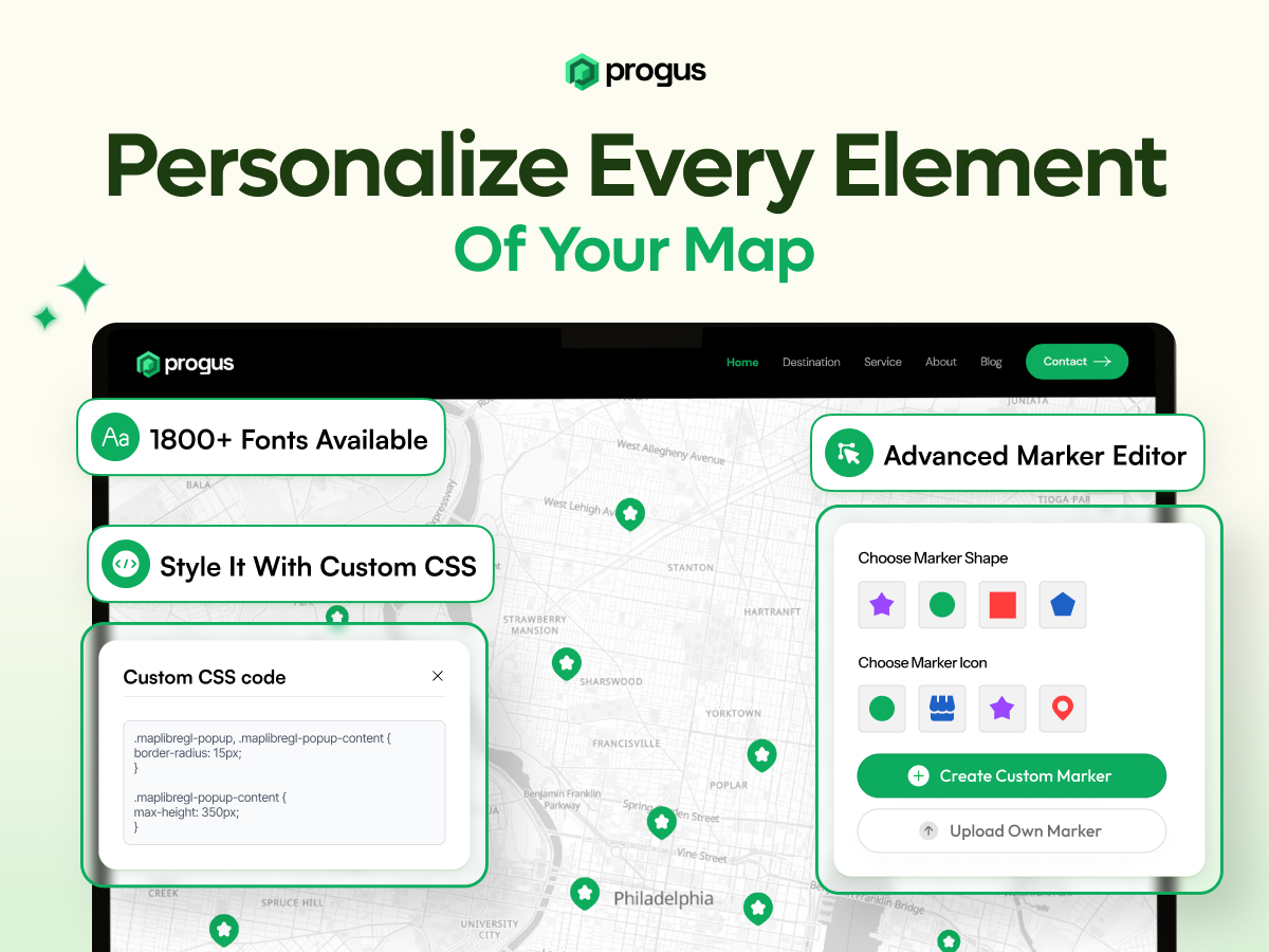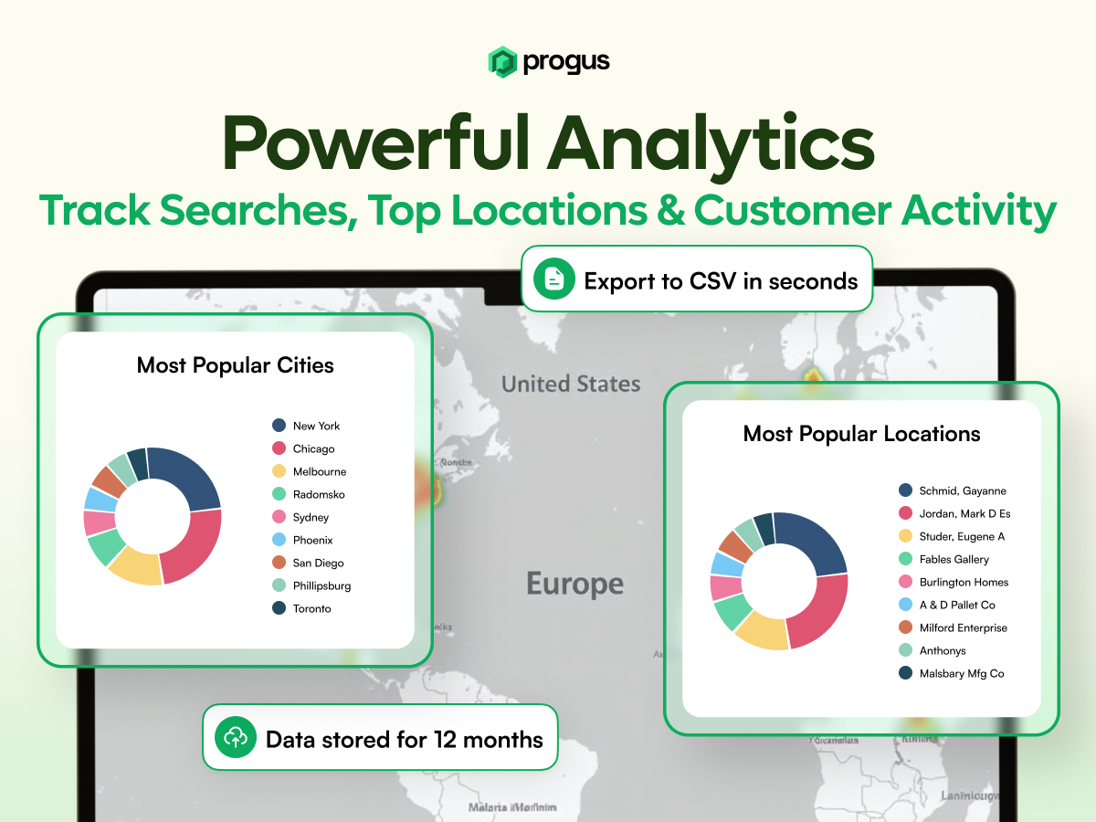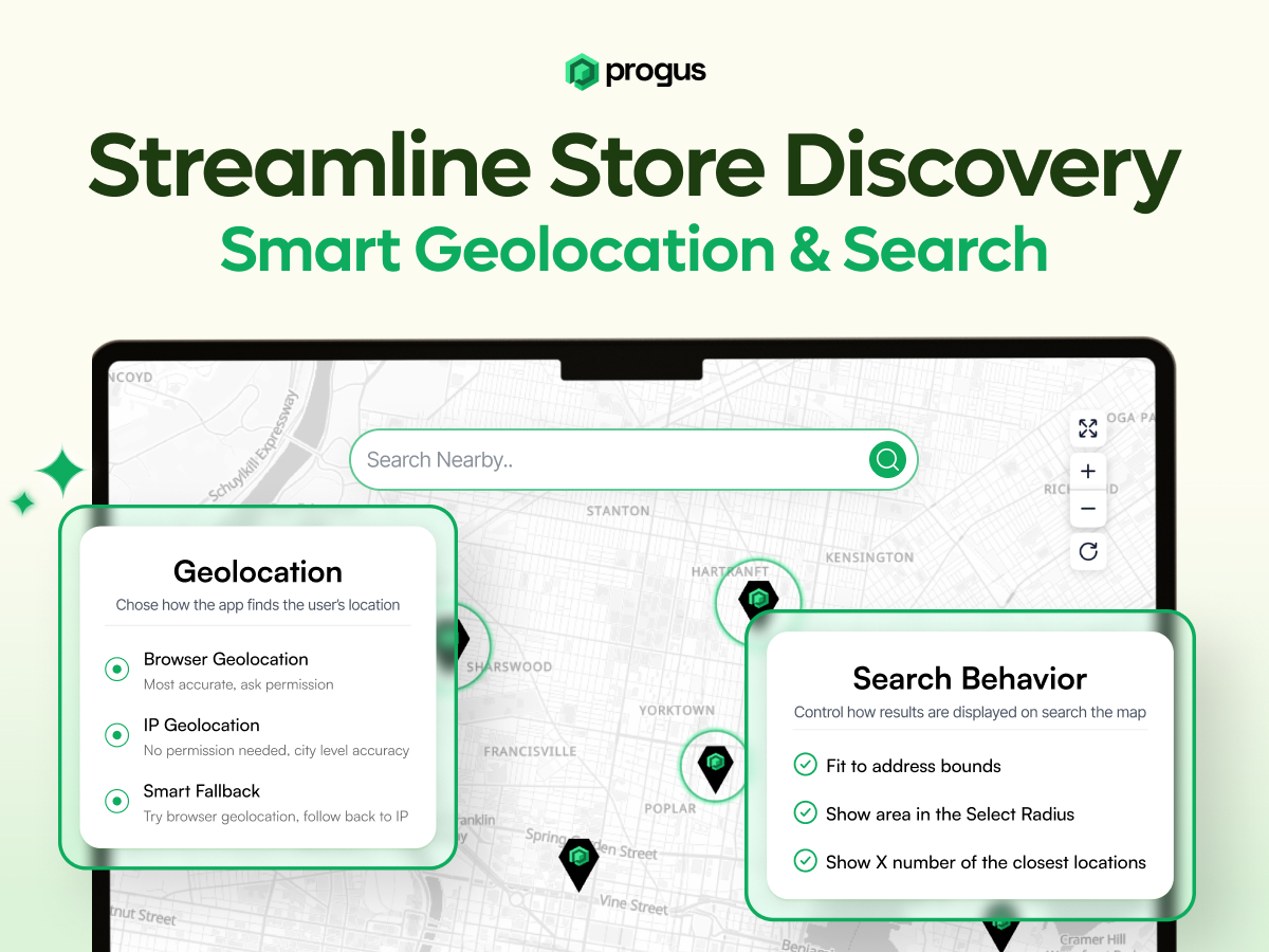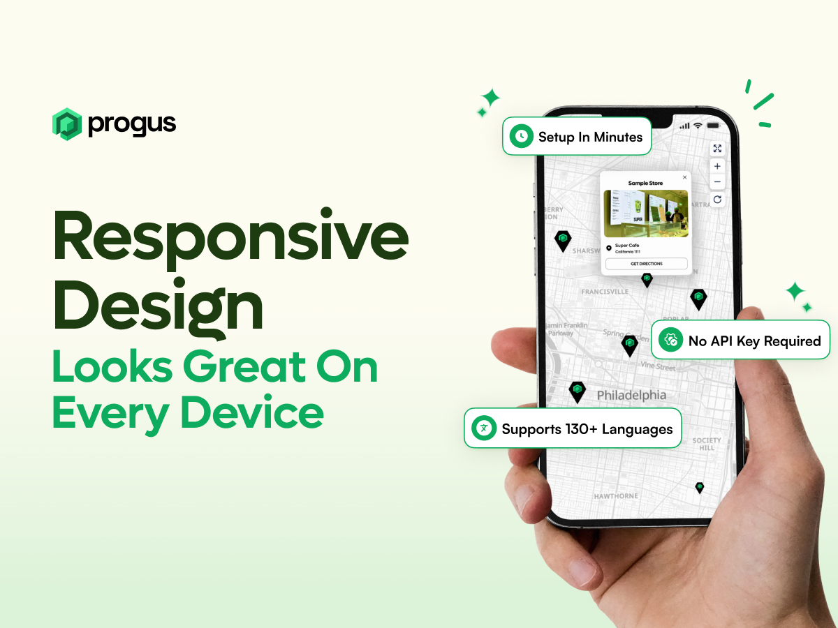 Progus Store Locator lets you add a store or dealer locator to your WordPress site instantly — no API key required. Display your locations on an interactive, customizable map and help customers find nearby stores right after installation.