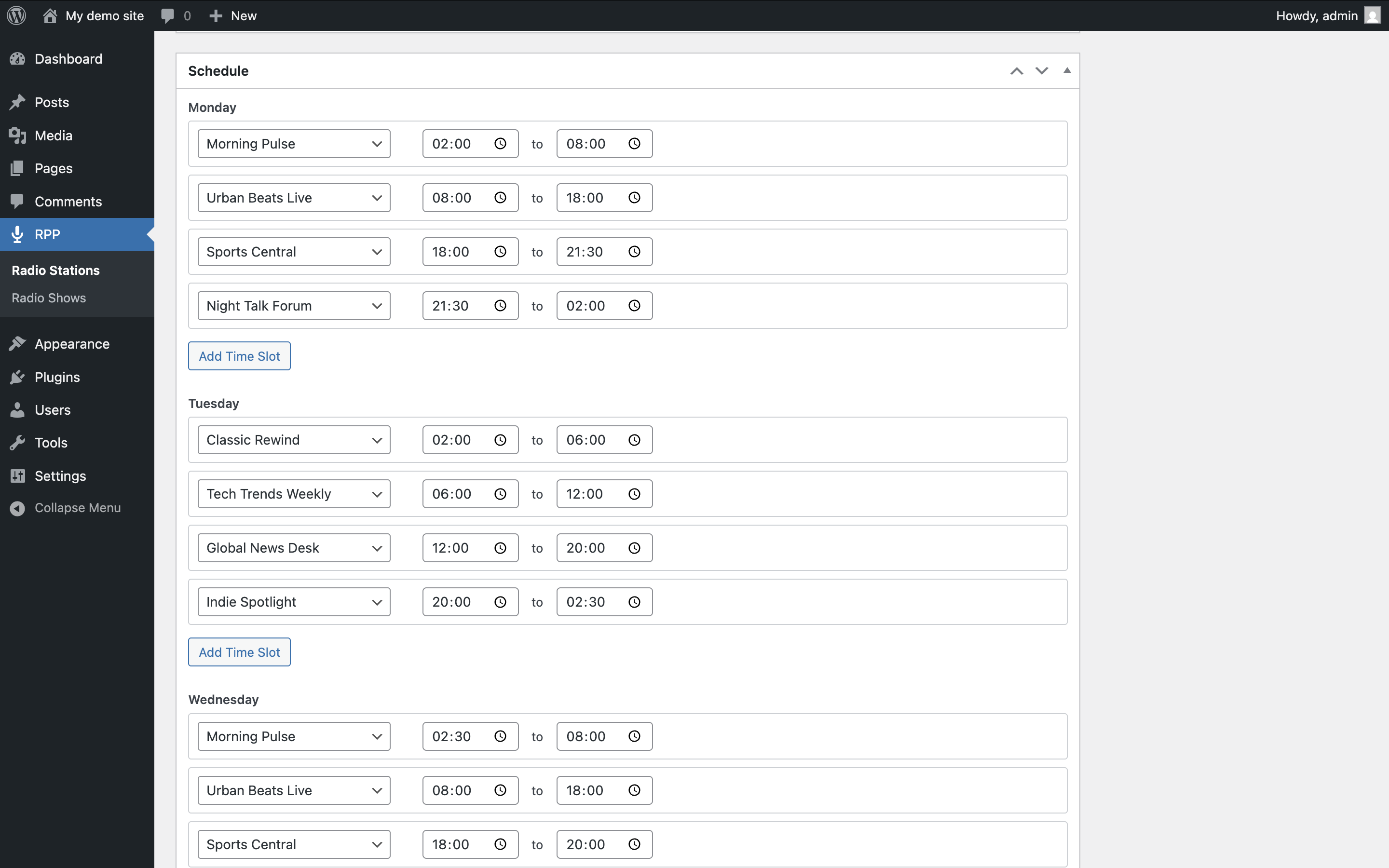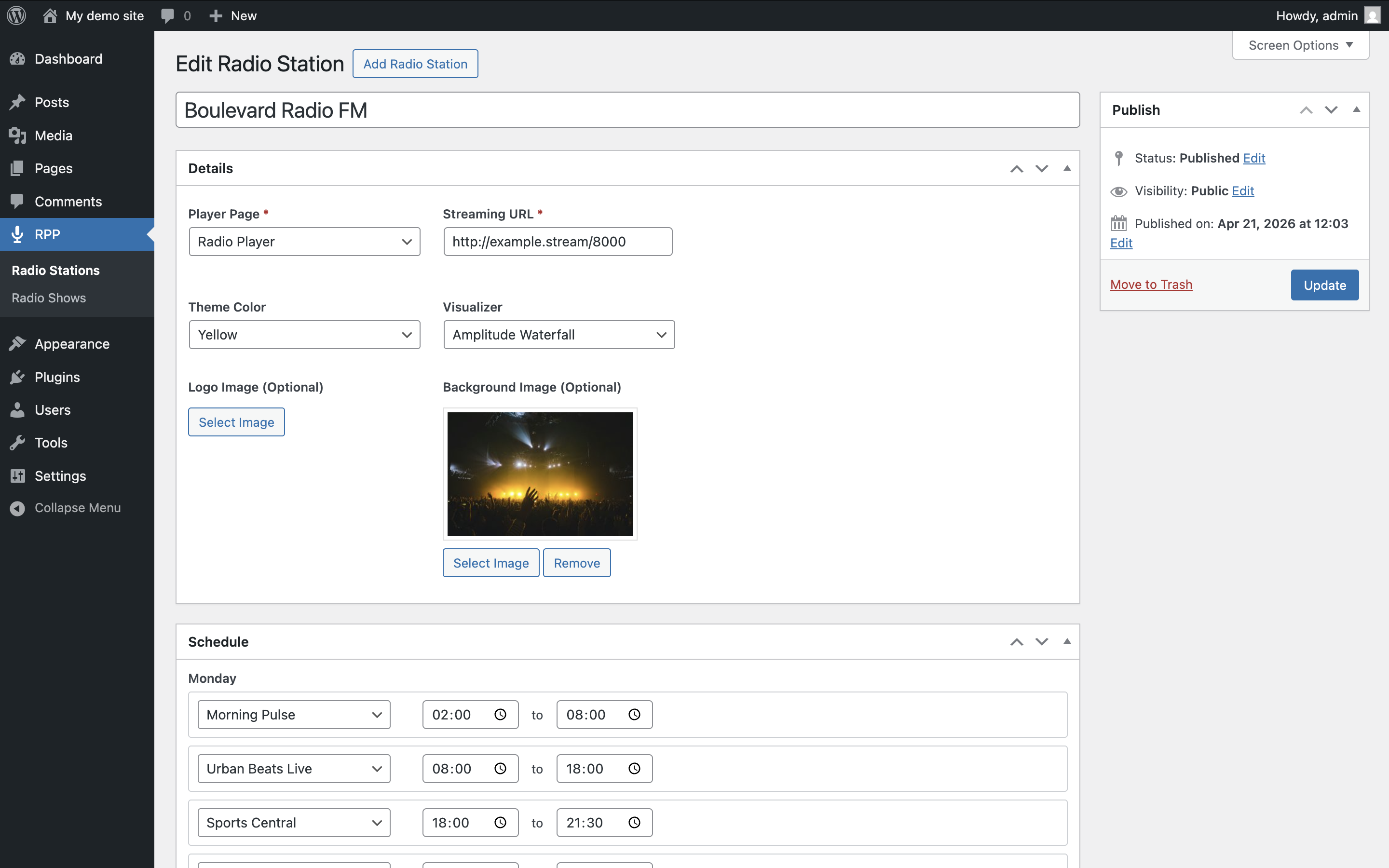 - Publish or update the station and visit the assigned page. Optionally use RPP Radio Shows to create radio shows and build the weekly schedule on each station.