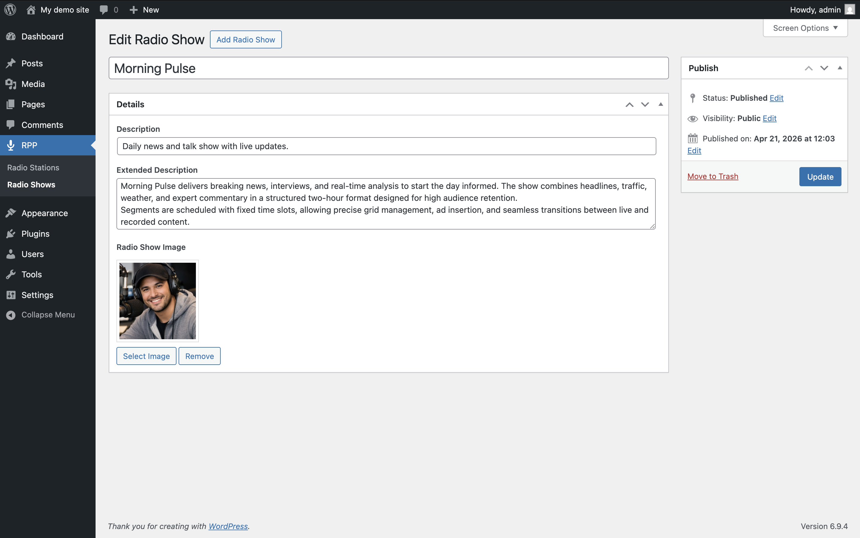 - Radio Shows List Block – Add a Block to list all radio shows for a selected station, with optional image, extended description, and broadcast schedule.