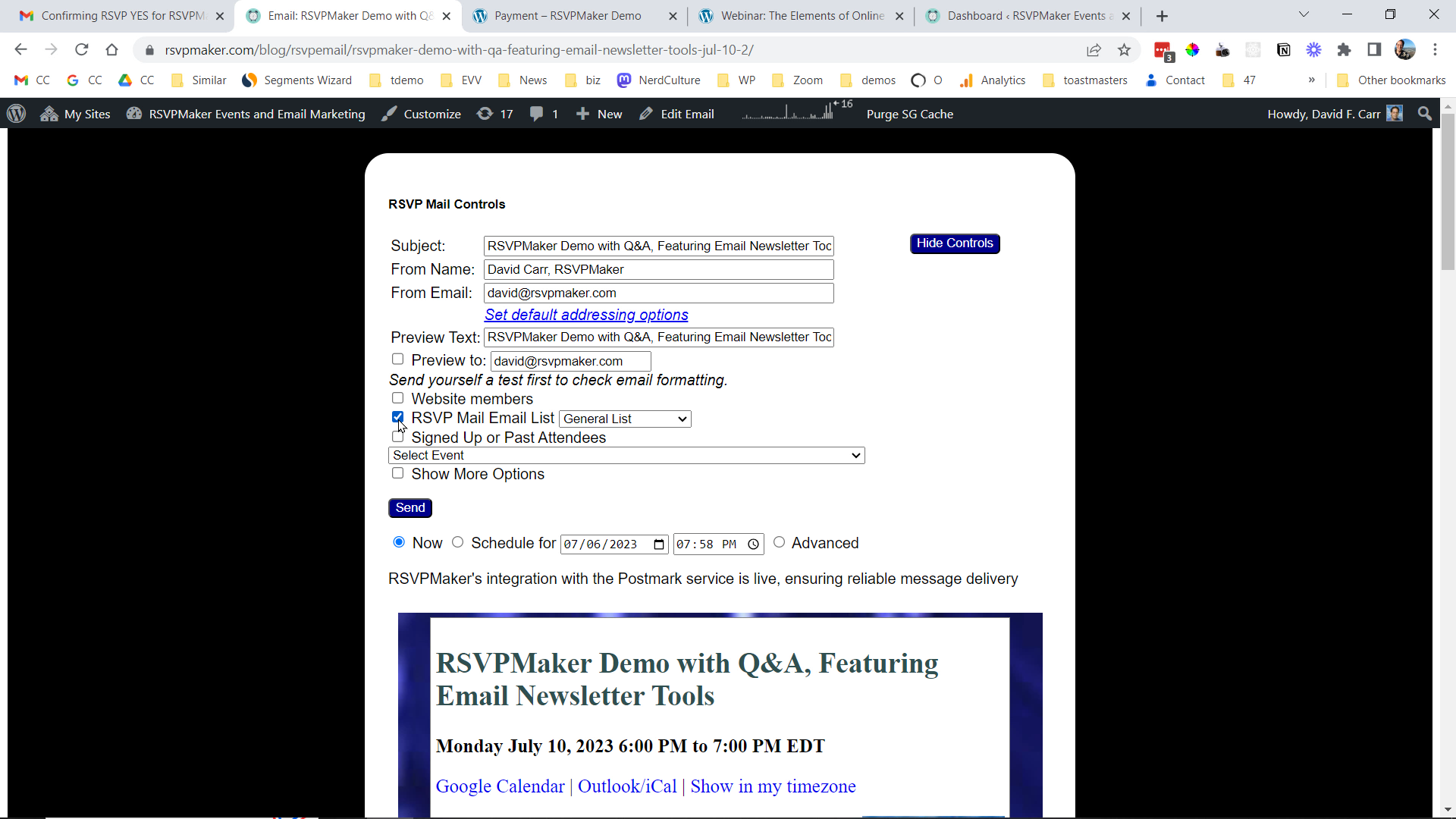 When implemented in combination with Postmark for reliable email delivery, RSVPMaker can function as an alternative to Mailchimp or MailPoet that allows you to format messages in the WordPress editor and easily incorporate events (for invitations) and blog posts or excerpts from posts (for email newsletters and promotions).