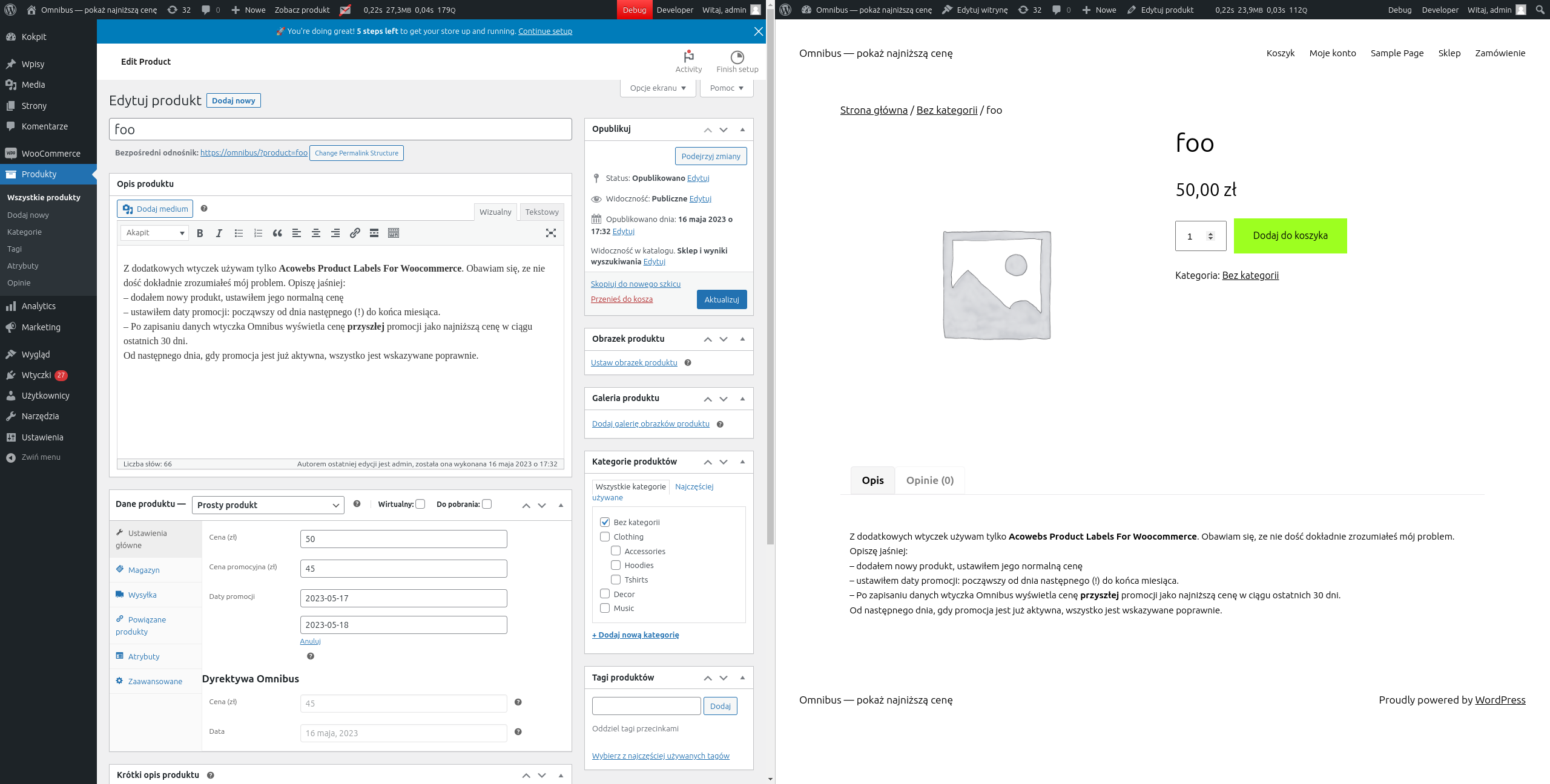 Wtyczka źle pokazuje najniższą cenę w następującej sytuacji: dzisiaj dodaję nowy produkt, określam wszystkie jego parametry, w tym cenę. Równocześnie ustalam z datą od następnego dnia(!!) promocję okresową z niższą ceną. Po zapisaniu danych wtyczka pokazuję PRZYSZŁĄ cenę promocyjną jako najniższą z ostatnich 30 dni, a to jest oczywista nieprawda.