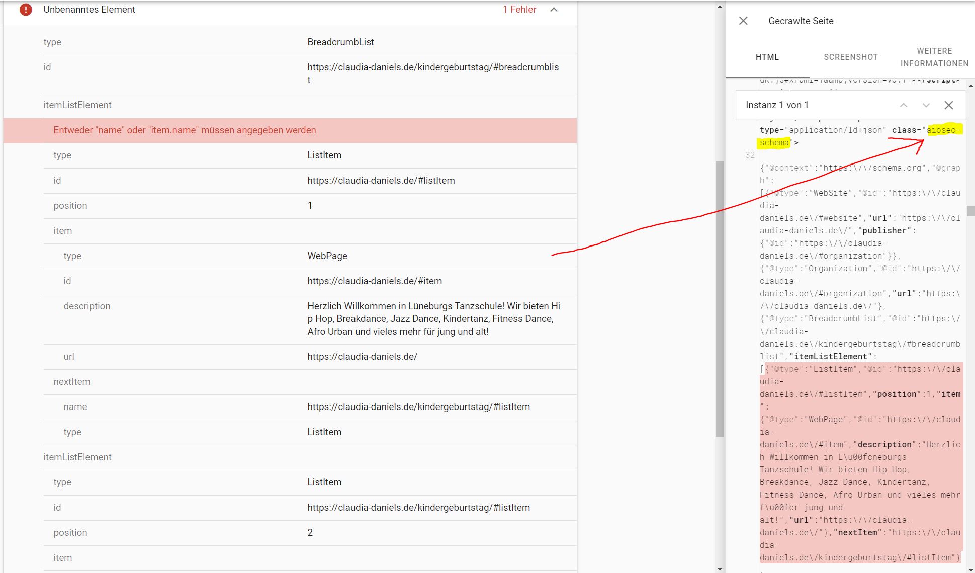 google says “Entweder “name” oder “item.name” müssen angegeben werden” for the breadcrumb schema data: