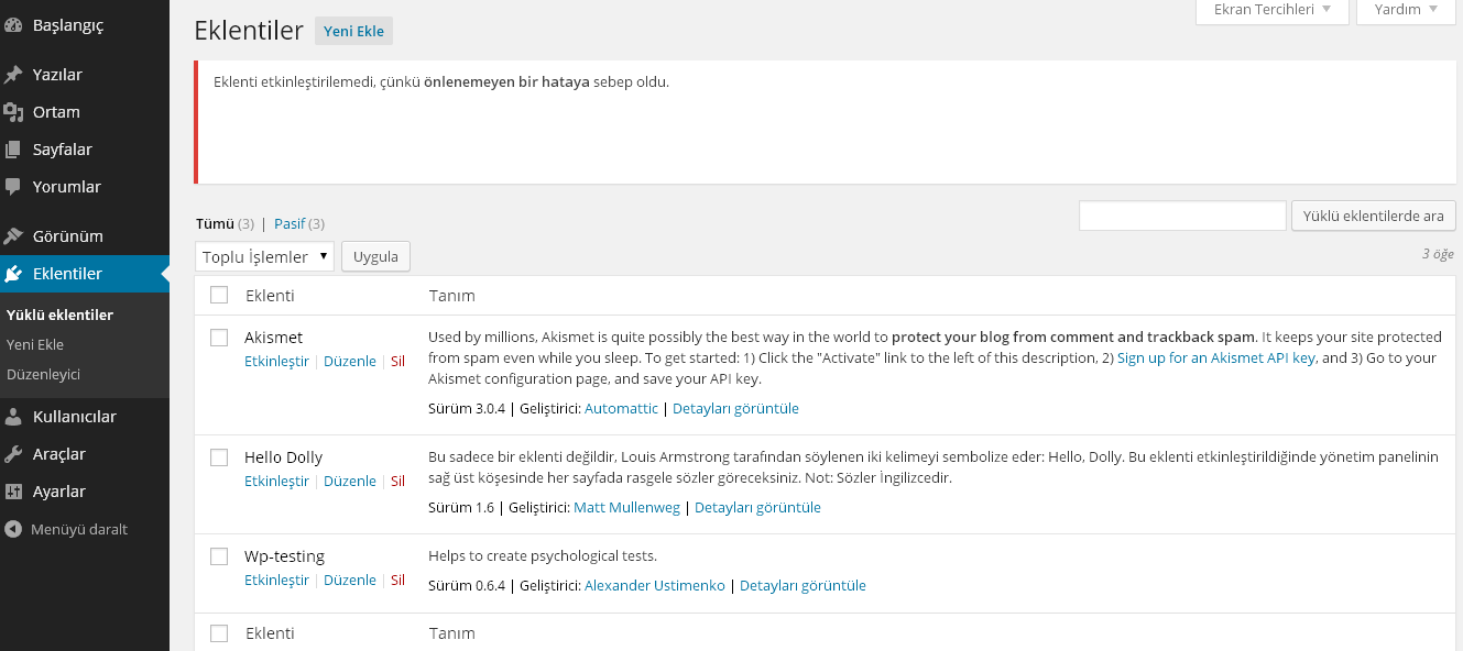 Eklenti etkinleştirilemedi, çünkü önlenemeyen bir hataya sebep oldu.
