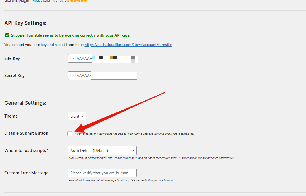 unfortunatly it still doesn’t work. I selected the “All Pages” option, the captcha shows, loads, completes but the button stays slightly transparent: