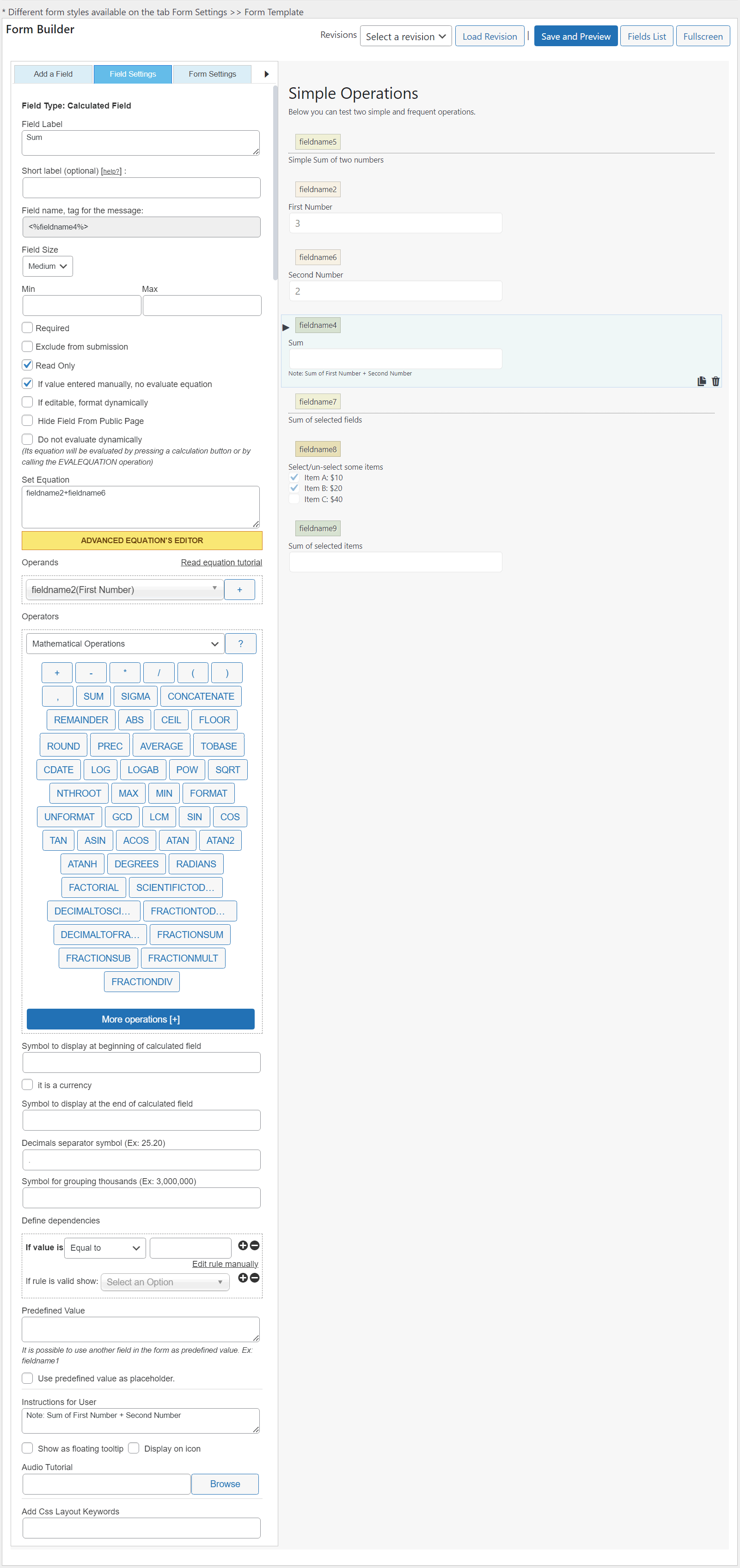 Multiple controls are common in other forms builders, like number fields, text fields, radio buttons, dropdown menus, etc. but pay attention to the “Calculated Field” control (it has a different color). This control makes the magic. The calculated field includes the “Set equation” attribute where you can edit the equations: